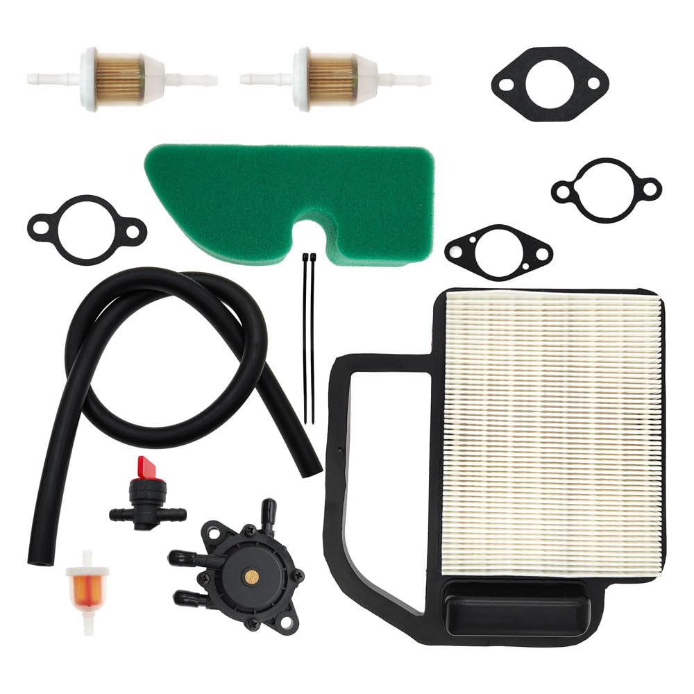 Resposta: O pacote inclui um carburador, uma vela de ignição, dois filtros de combustível, um filtro de ar, uma bomba de combustível, um filtro de óleo e um pré-filtro de ar.