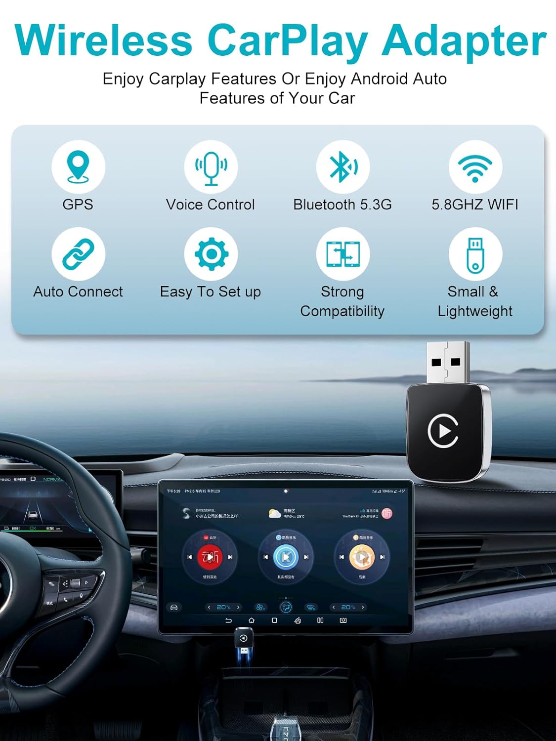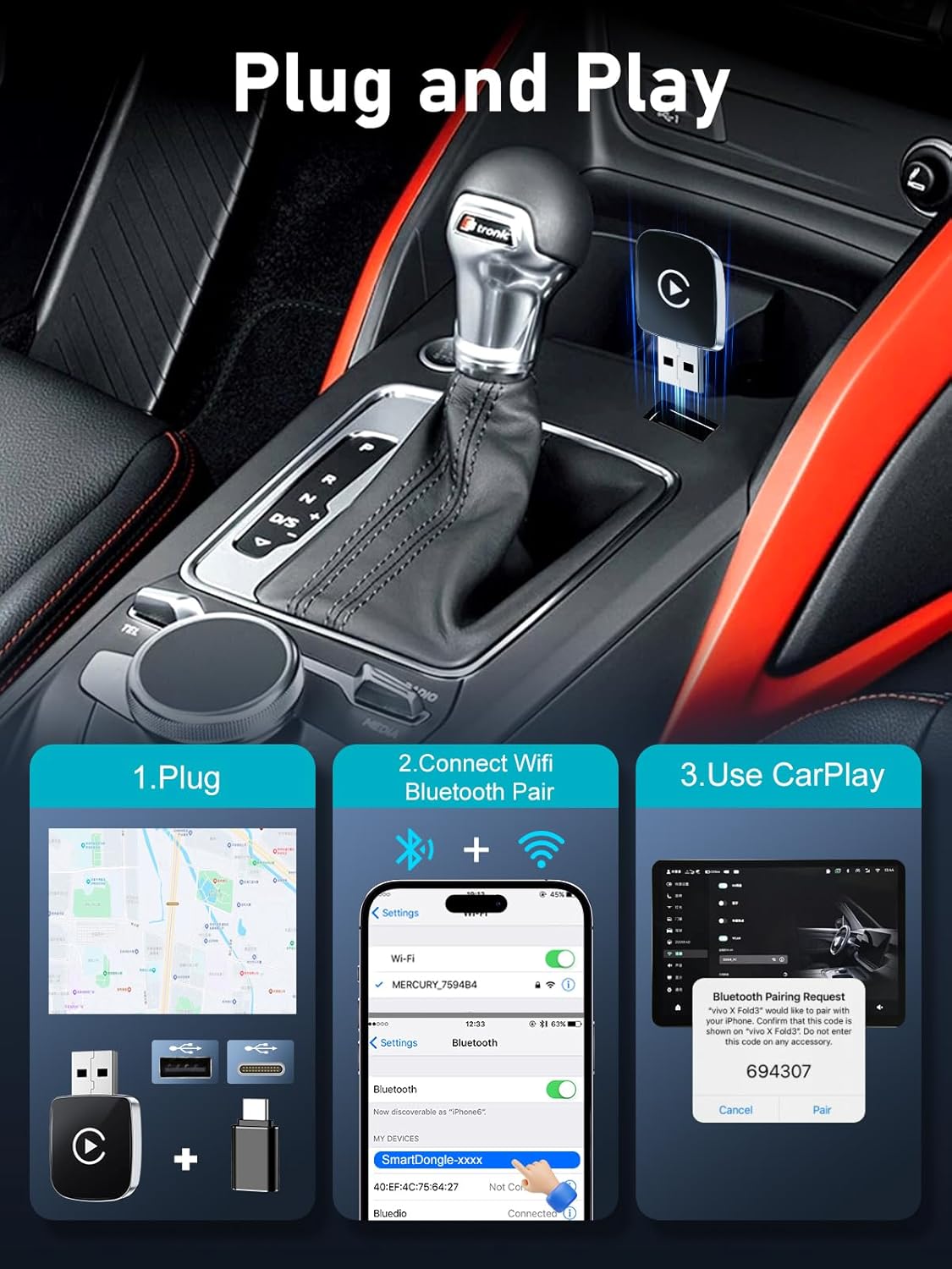 The Wireless CarPlay Adapter help owners looking to eliminate cables and enjoy a good driving experience. Just plug it into USB port and within seconds to set up per the Instruction, iPhone will connect wirelessly with zero latency