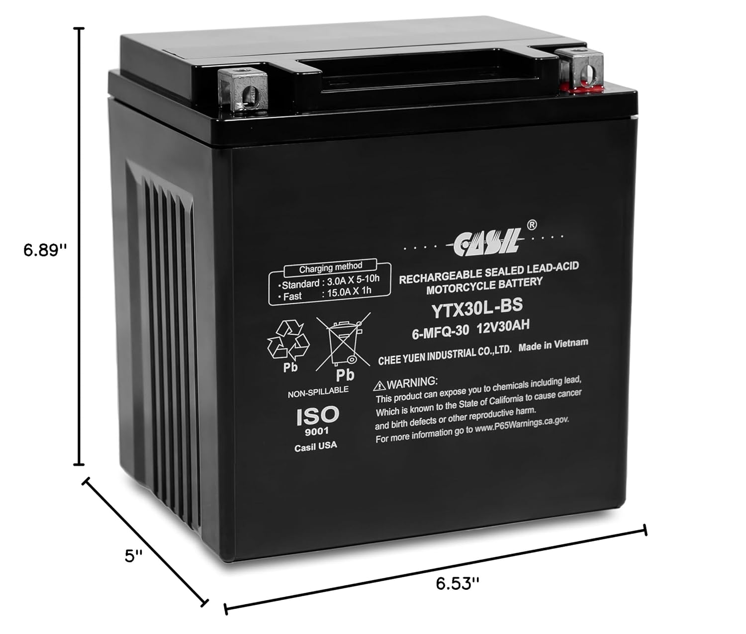 A bateria Casil YTX30L-BS Power Sports Replacement Yuasa YIX30L é a escolha ideal para motocicletas que exigem um desempenho excepcional e confiável. Com dimensões de 6.53 polegadas de comprimento, 5 polegadas de largura e 6.89 polegadas de altura, esta bateria pesa 21.8 libras e possui uma capacidade de 28AH, oferecendo uma corrente de arranque a frio (CCA) de 385. A tensão de operação é de 12V, e sua construção em material ABS garante durabilidade e resistência.