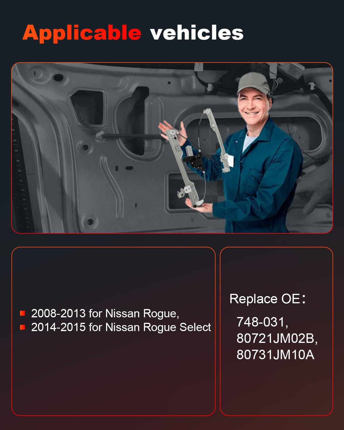 - Compatível com: Modelos de 2008 a 2013 para Nissan Rogue e 2014-2015 para Nissan Rogue Select. Este regulador de janela com motor é uma substituição direta, garantindo que você tenha um ajuste perfeito.