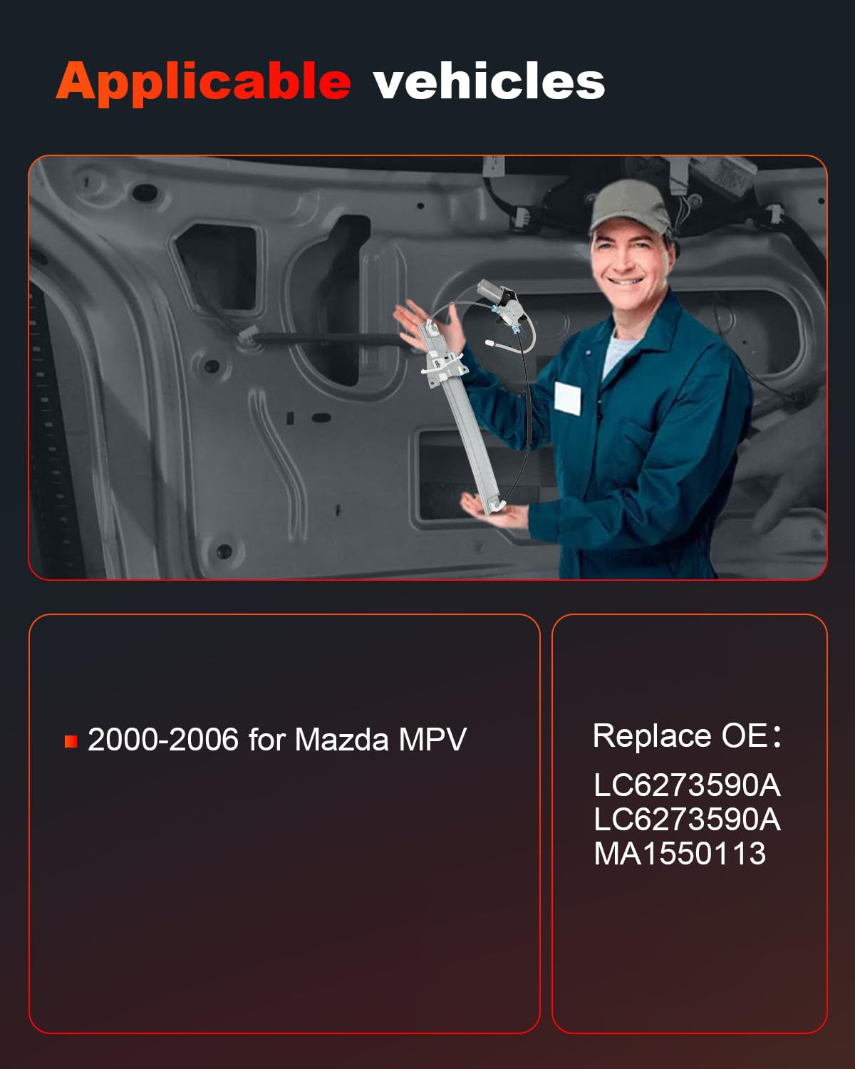 - Compatível com: 2000, 2001, 2002, 2003, 2004, 2005, 2006 para Mazda MPV. Substituição do regulador de janela com motor.