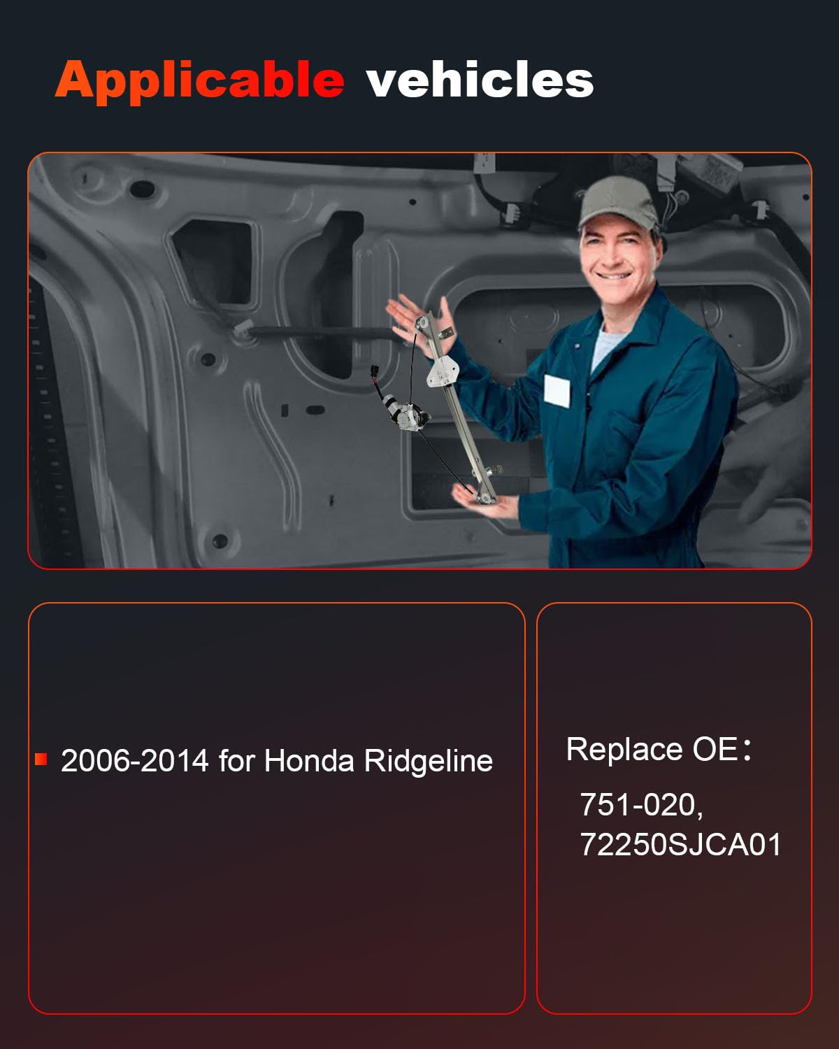- Compatível com: Modelos de 2006 a 2014 do Honda Ridgeline. O regulador de janela com motor é uma peça de reposição essencial para manter a performance do seu veículo.