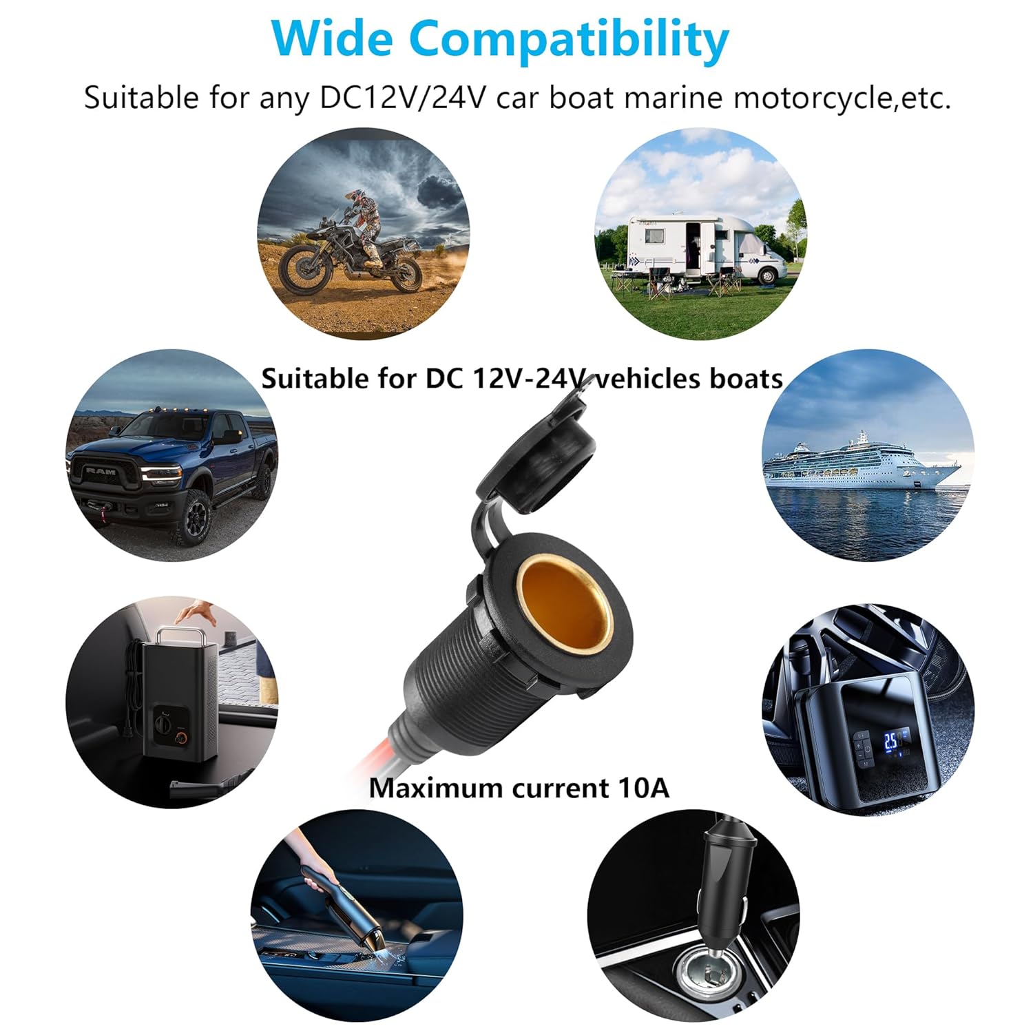 Equipado com um soquete de isqueiro de 12V, contatos de latão e um protetor de cabo de borracha, o CERRXIAN garante uma conexão segura e durável. A construção em cobre puro do soquete proporciona uma excelente condução elétrica, enquanto o capô à prova d’água e à prova de poeira protege contra as intempéries, tornando-o ideal para uso em ambientes externos.
