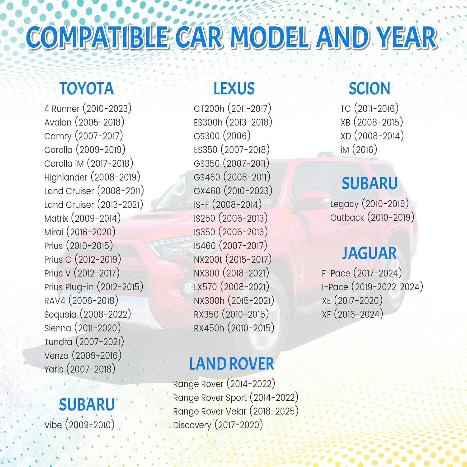 – Compatibilidade: Projetado para modelos como Camry, Corolla, RAV4, 4Runner, Prius, Highlander, ES300H e mais.