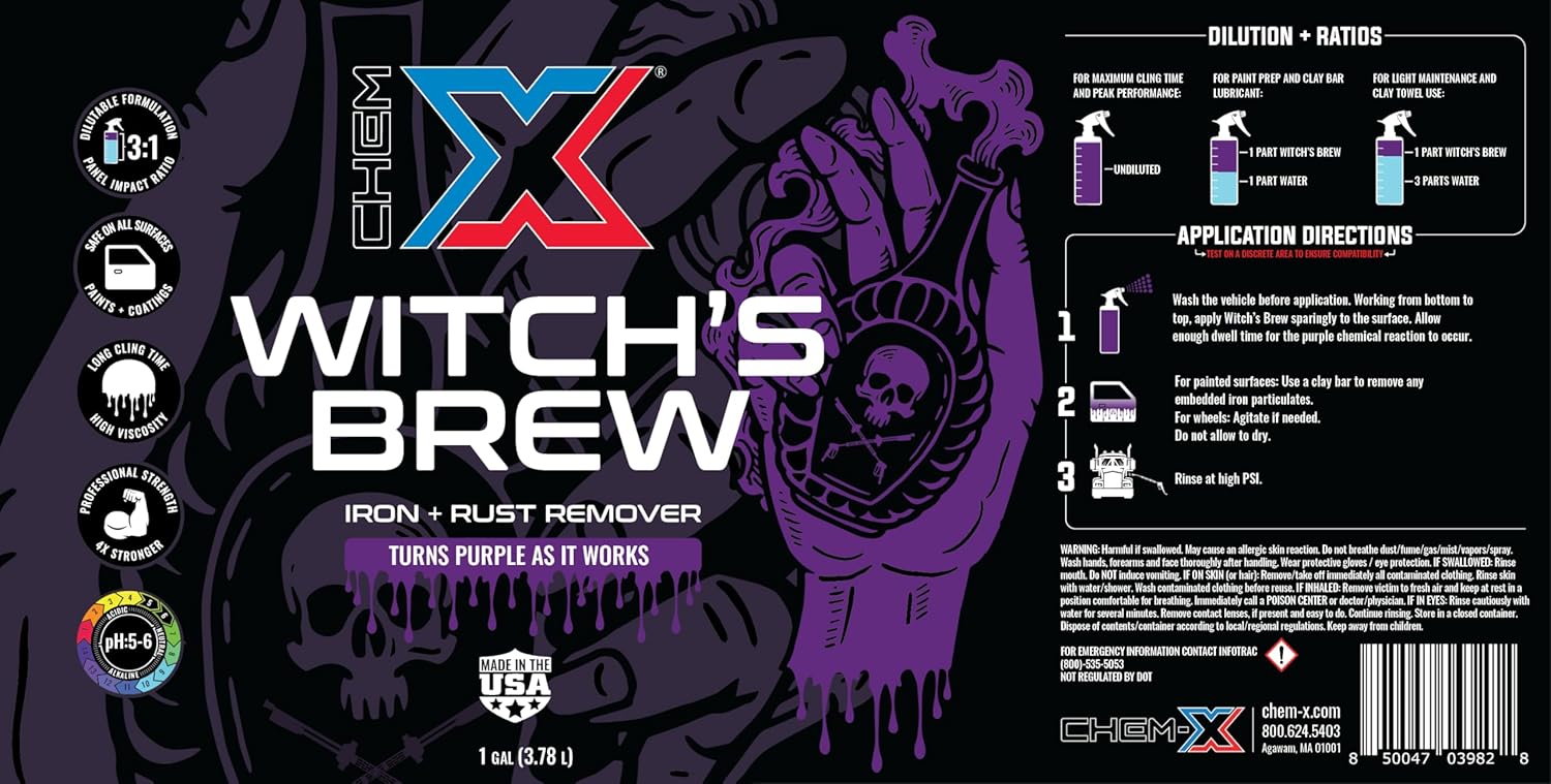 Descubra o poder do Chem-X Witch’s Brew, um removedor de ferro e ferrugem que redefine os padrões de limpeza automotiva. Com uma fórmula potente de 4x força, este produto foi desenvolvido para oferecer um impacto máximo na remoção de manchas de ferro e ferrugem, tornando-se uma solução indispensável para profissionais e entusiastas de automóveis. A fórmula adere às superfícies, garantindo uma eficácia superior, com uma relação de impacto de painel de 3:1, posicionando o Witch’s Brew como um dos removedores de ferro mais eficazes disponíveis no mercado.