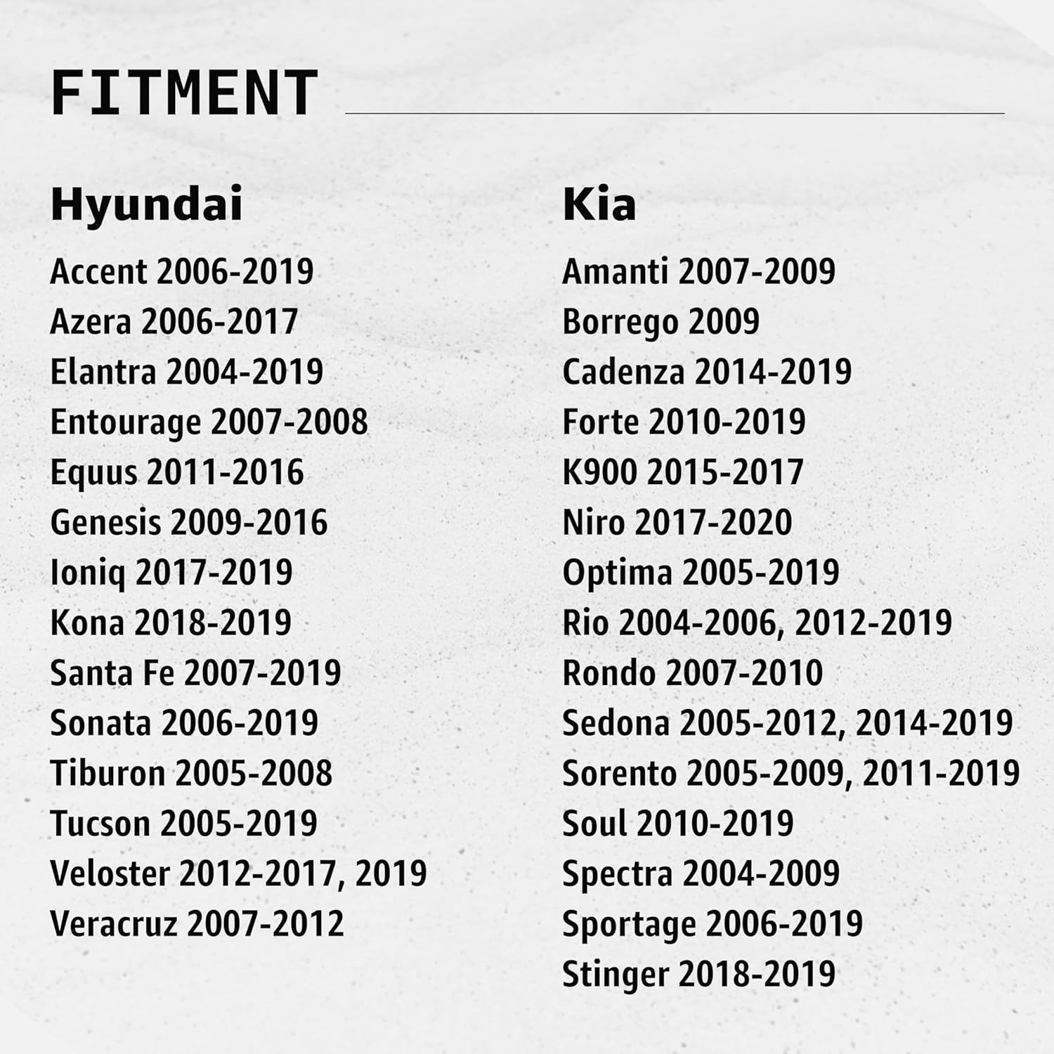 – Kia: Amanti (07-09), Borrego (09), Cadenza (14-19), Forte (10-19), K900 (15-17), Niro (17-20), Optima (05-19), Rio (04-06, 12-19), Rondo (07-10), Sedona (05-12, 14-19), Sorento (05-09, 11-19), Soul (10-19), Spectra (04-09), Sportage (06-19), Stinger (18-19).