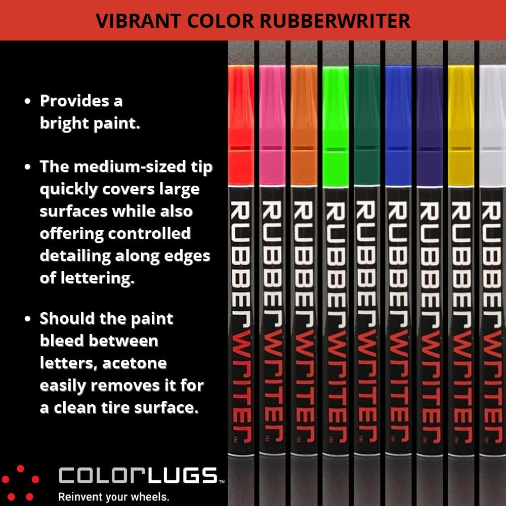 Desenvolvido para resistir à lavagem de carros, o RubberWriter é à prova d’água e não desbota, mesmo sob condições climáticas adversas. Com o ColorLugs RubberWriter Paint Pen, você pode aplicar um toque pessoal aos seus pneus no conforto da sua casa, garantindo que eles se destaquem em qualquer estrada.