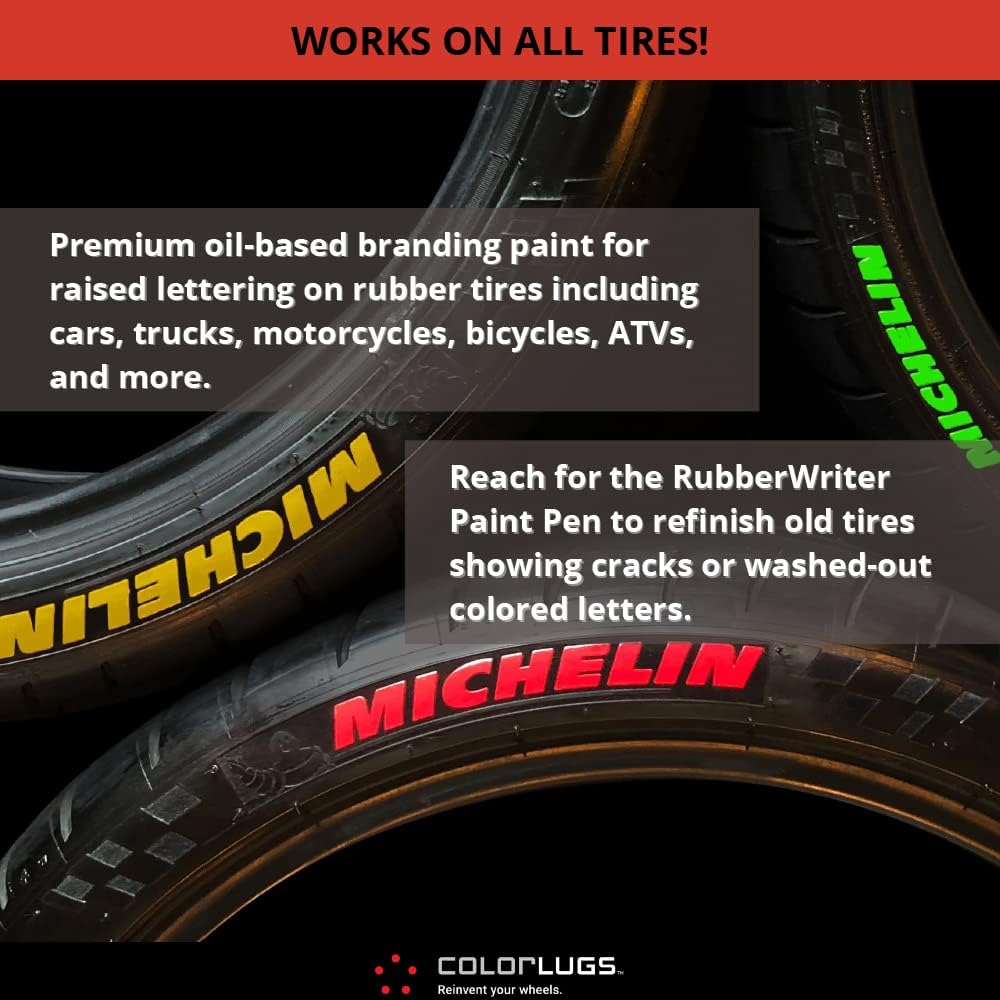 Transforme a aparência dos seus pneus com o ColorLugs RubberWriter Paint Pen, um marcador de tinta à base de óleo projetado especificamente para a personalização de letras em pneus de borracha. Este produto premium é ideal para carros, caminhões, motocicletas, bicicletas, ATVs e muito mais. Se você tem pneus antigos com letras desgastadas ou rachaduras, o RubberWriter é a solução perfeita para revitalizá-los. Com uma cor vibrante e duradoura, você pode dar um novo visual aos seus pneus de forma rápida e fácil.