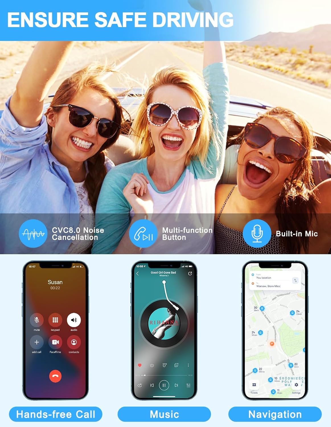 O adaptador também conta com um microfone embutido que capta o som com clareza, permitindo chamadas em modo mãos-livres. O botão “MFB” facilita a resposta, rediscagem, encerramento ou rejeição de chamadas, garantindo que você mantenha as mãos no volante. Além disso, o receptor de áudio Bluetooth suporta notificações de voz de aplicativos de navegação, permitindo que você dirija com segurança sem desviar o olhar do caminho.