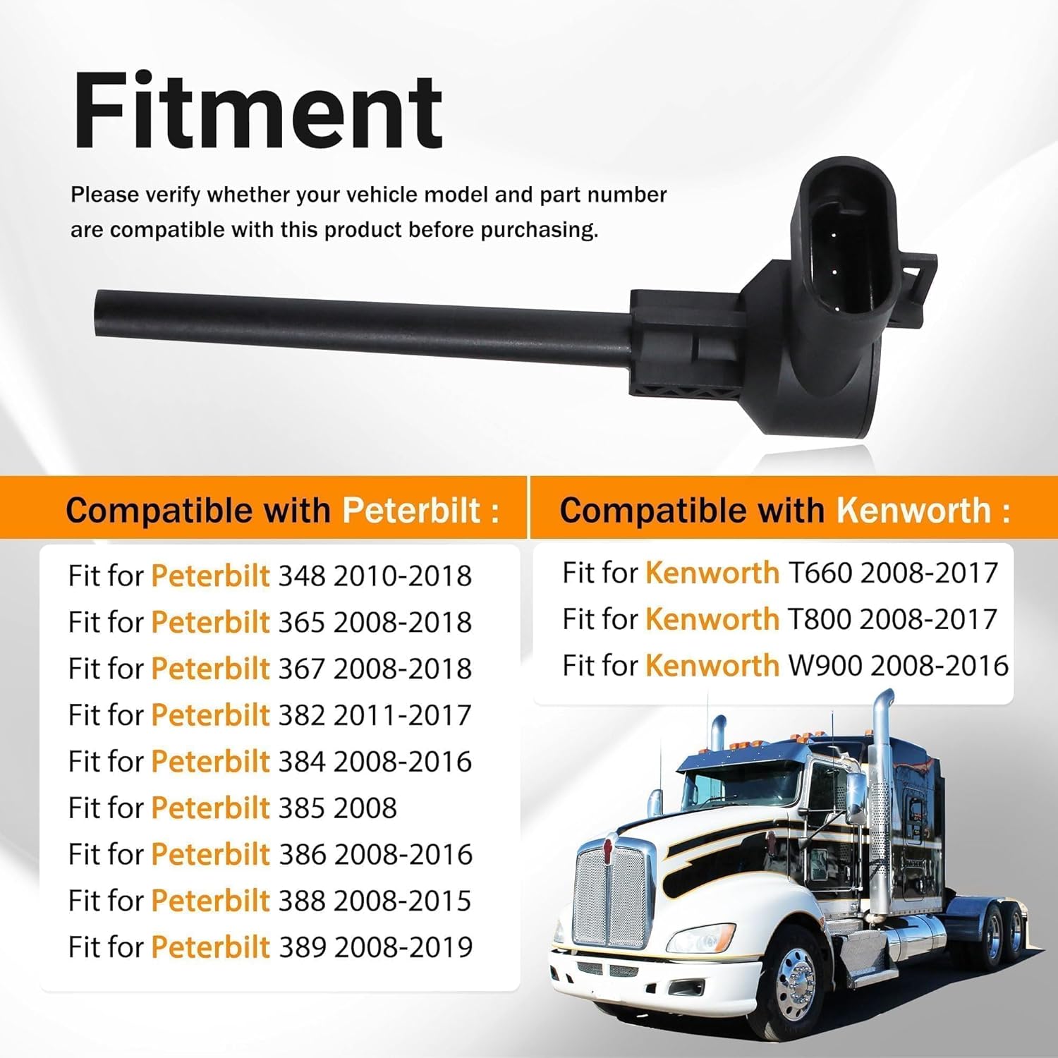 • Compatibilidade: O sensor é compatível com os seguintes modelos: Kenworth T660 (2008-2017), Kenworth T800 (2008-2017), Kenworth W900 (2008-2016), Peterbilt 348 (2010-2018), Peterbilt 365 (2008-2018), Peterbilt 367 (2008-2018), Peterbilt 382 (2011-2017), Peterbilt 384 (2008-2016), Peterbilt 385 (2008), Peterbilt 386 (2008-2016), Peterbilt 388 (2008-2015) e Peterbilt 389 (2008-2019).