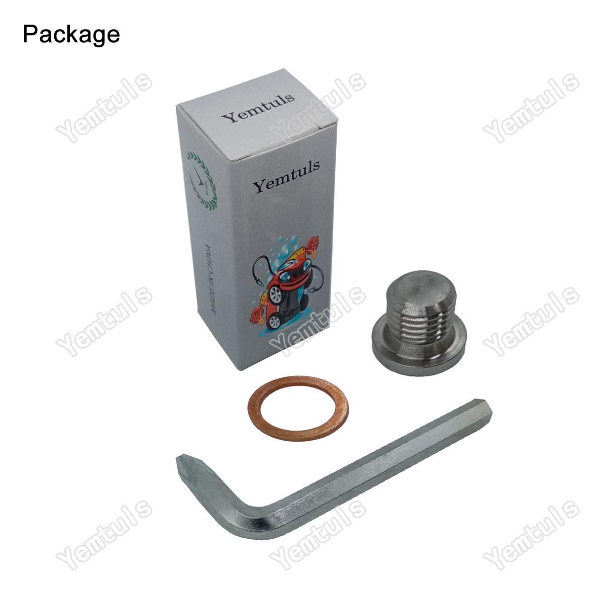 Resposta: O pacote contém dois plugues de drenagem de óleo e duas arruelas de compressão, além de uma chave hexagonal para instalação.