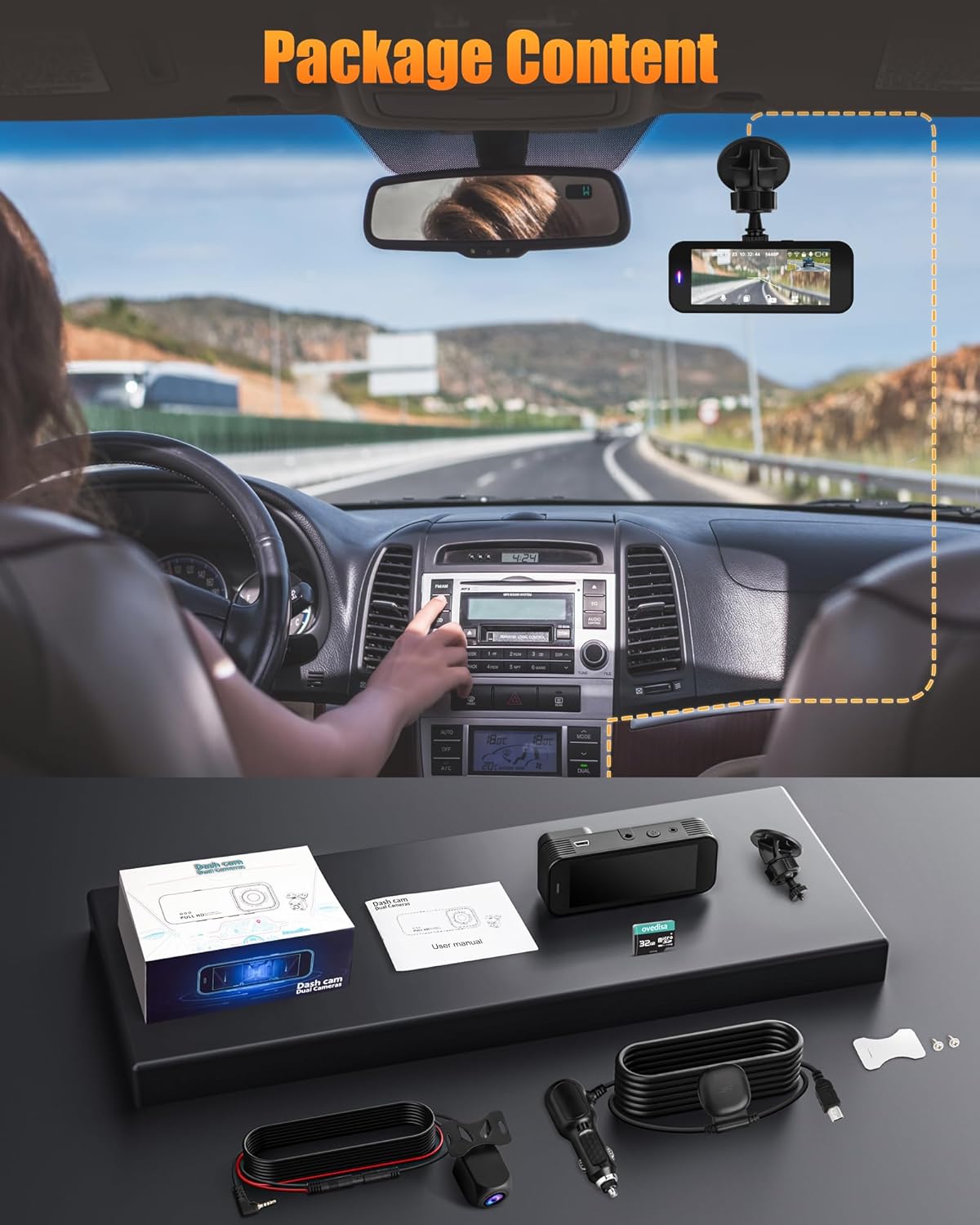 1 *8K Dash Cam, 1*2.5K Rear Camera, 1*Rear Camera Cable;1 *Power Supply Cable with Car Charger;1 *Adhesive Mount, 1 *32GB Card(In equipment);1 *User Manual