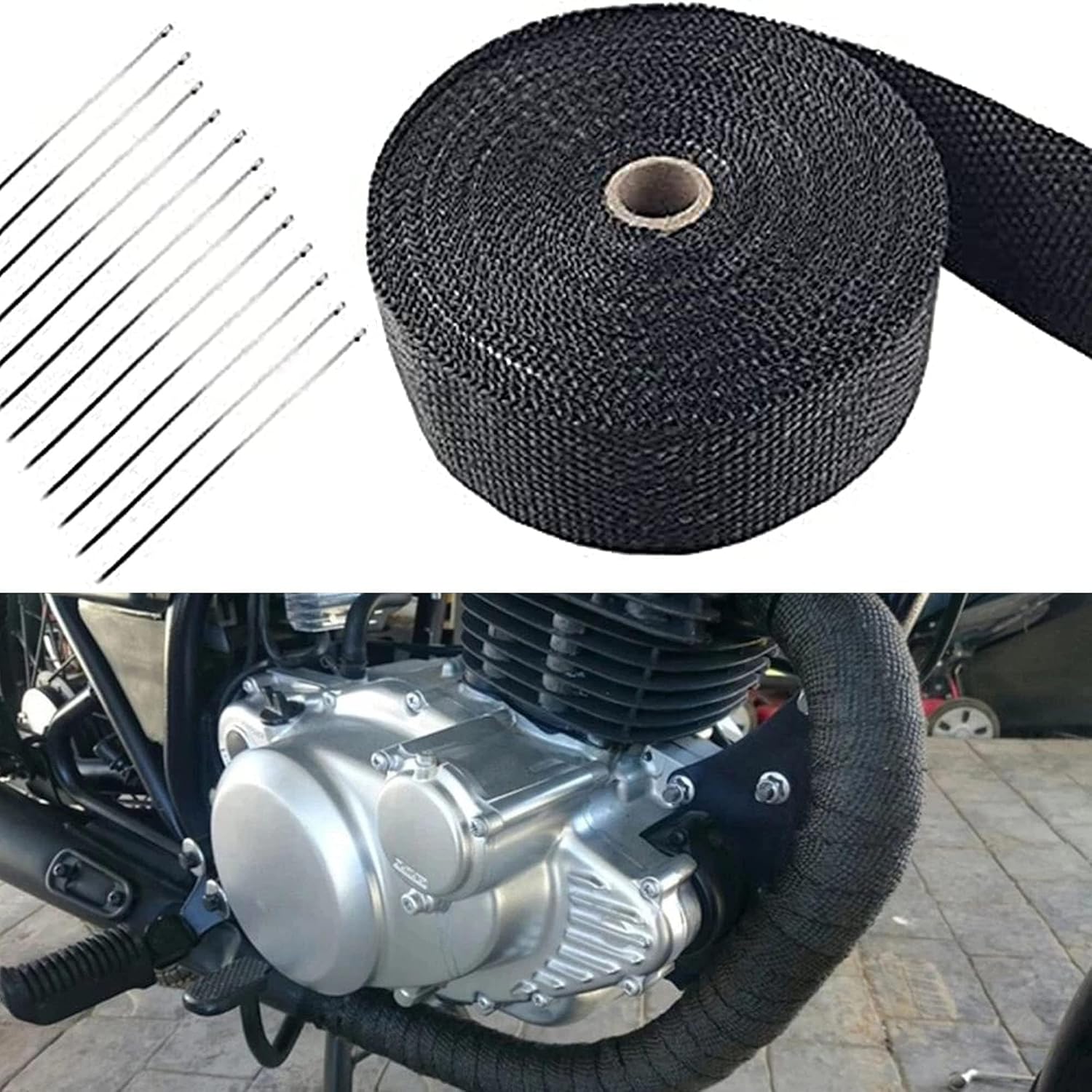 Guia de Instalação: Para uma instalação eficaz, recomenda-se mergulhar a fita de calor em água por 10 a 20 minutos antes de aplicá-la. Envolva a fita ao redor do tubo de escape, fixando-a com os laços de aço inoxidável que acompanham o kit. É aconselhável aplicar mais de duas camadas na área do tubo de escape mais próxima ao motor, onde a temperatura é mais elevada. (Dica: Utilize luvas durante todo o processo de instalação.)