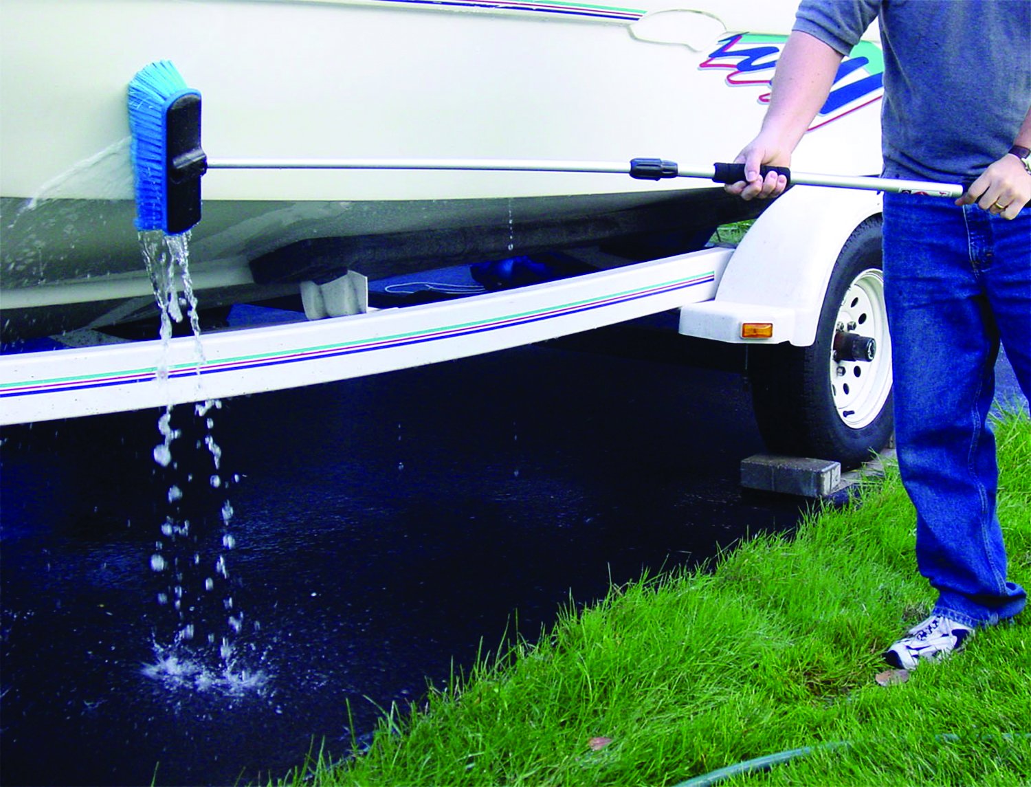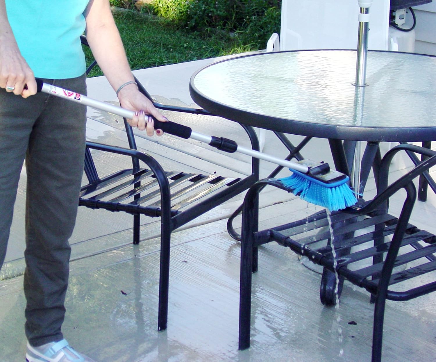 I bought this to use on my boat side and deck to quickly clean off the dirt, saltwater and blood, etc after a day on the water. It does exactly what I hoped it would do, it makes cleanup a breeze. Since the bristles are softer, as to not scratch the gel coat I had to buy another slightly stiffer brush for the scrubbing, but I knew that up front.