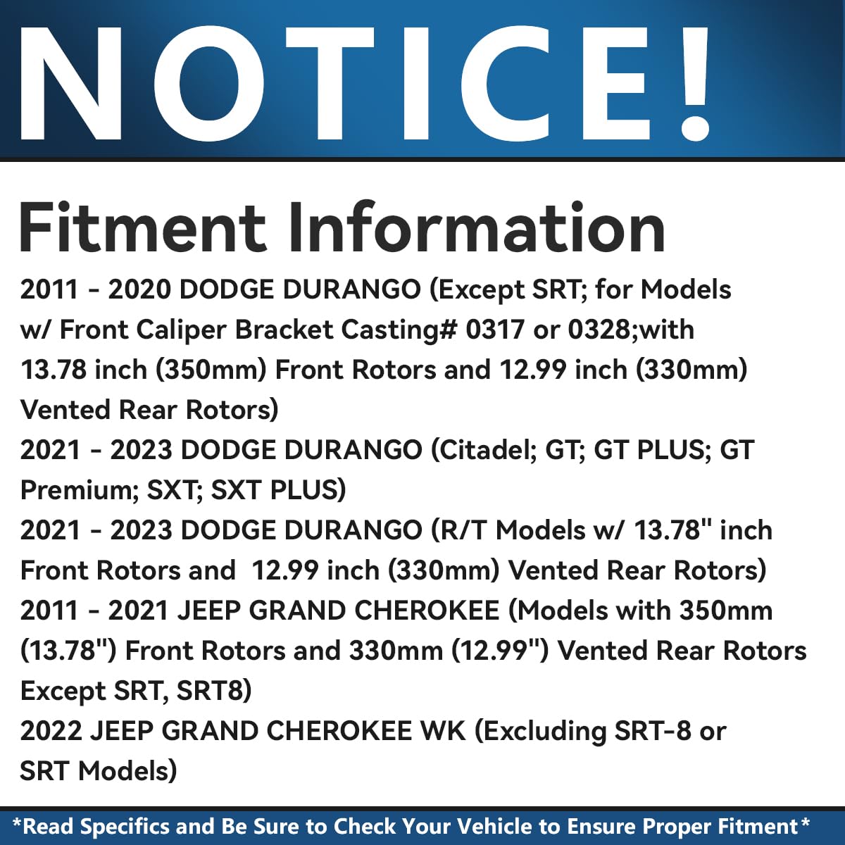 – Jeep Grand Cherokee (2011-2021): Modelos com rotores dianteiros de 350mm e traseiros ventilados de 330mm; exceto SRT e SRT8; incluindo o modelo 2022 Jeep Grand Cherokee WK (exceto SRT-8 ou SRT).