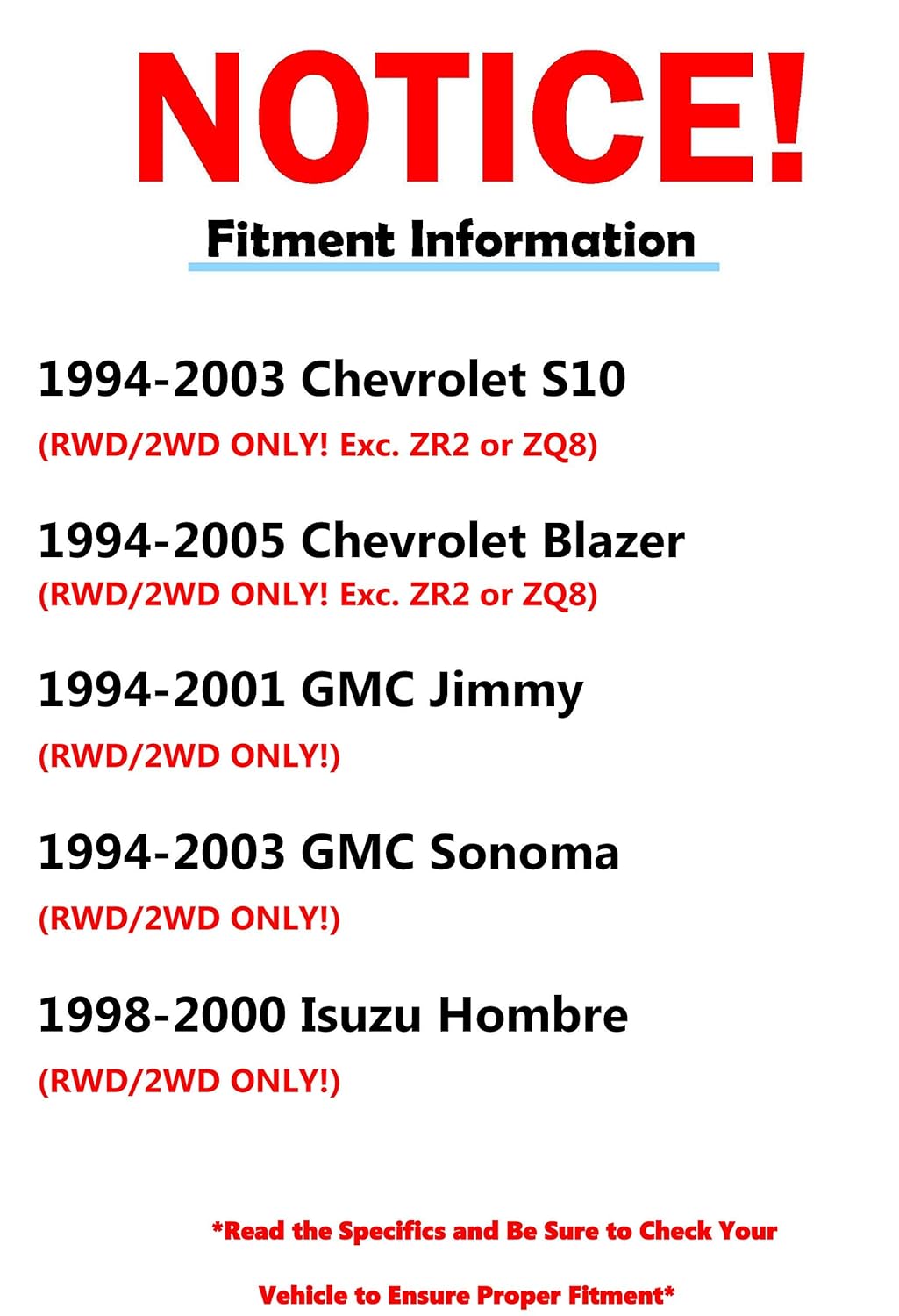 - Substituição de Amortecedores para 1994-2003 Chevrolet S10 (APENAS RWD/2WD; Exc. ZR2 ou ZQ8) – [1995-2005 Chevrolet Blazer (APENAS RWD/2WD)] – 1994 Chevrolet S10 Blazer (APENAS RWD/2WD) – [1994-2004 GMC Jimmy (APENAS RWD/2WD)] – 1994-2003 GMC Sonoma (APENAS RWD/2WD) – [1998-2000 Isuzu Hombre (APENAS RWD/2WD)]