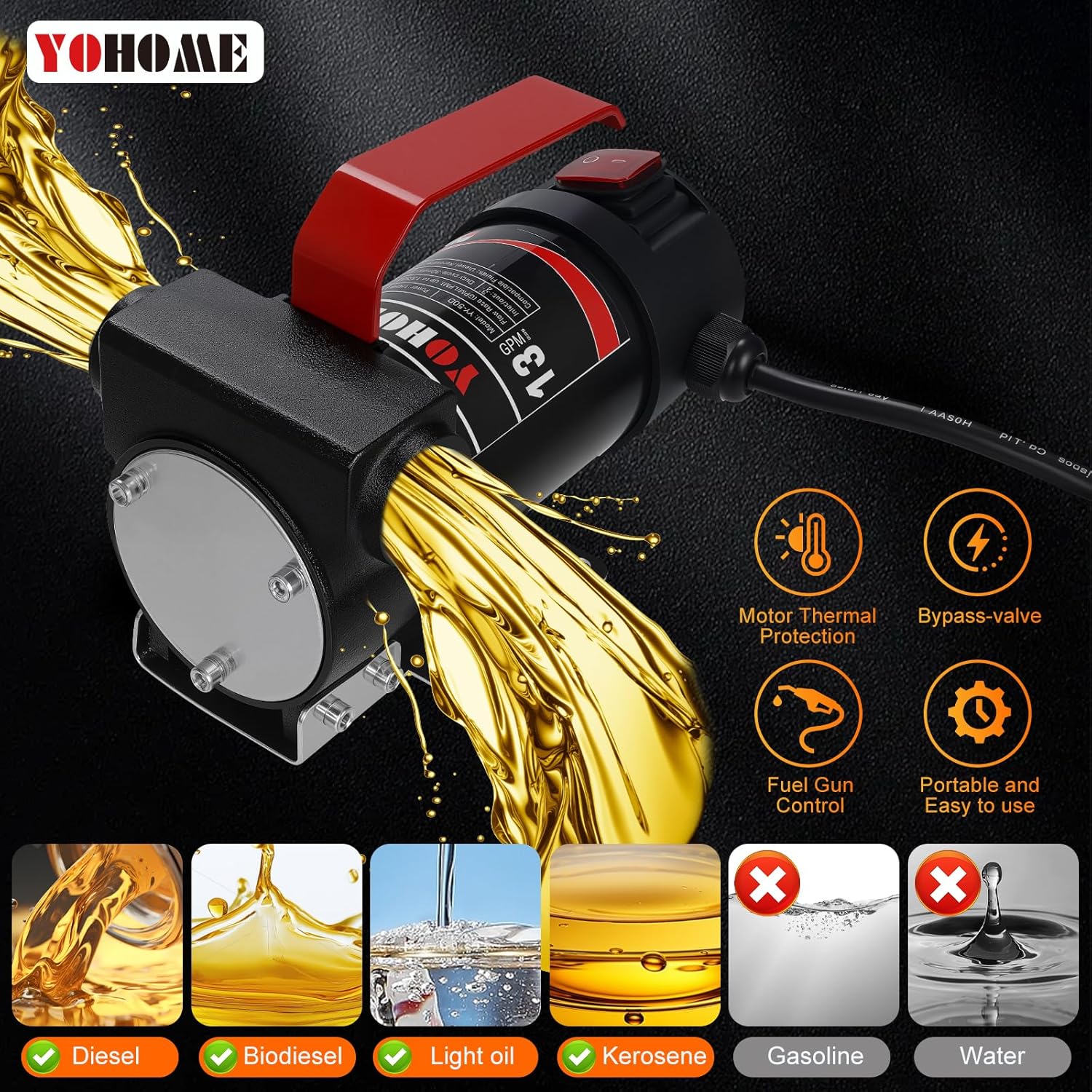 Ideal para aplicações multifuncionais, esta bomba é perfeita para transferir óleos de baixa viscosidade, como diesel, querosene, biodiesel e óleo de motor. Seu uso é amplamente recomendado em fazendas, canteiros de obras, oficinas mecânicas e em equipamentos domésticos e externos. É importante ressaltar que, durante a operação, o uso de óculos de proteção e equipamentos de segurança para as mãos é altamente recomendado. (Nota: Não utilize para bombear gasolina, álcool ou água.)