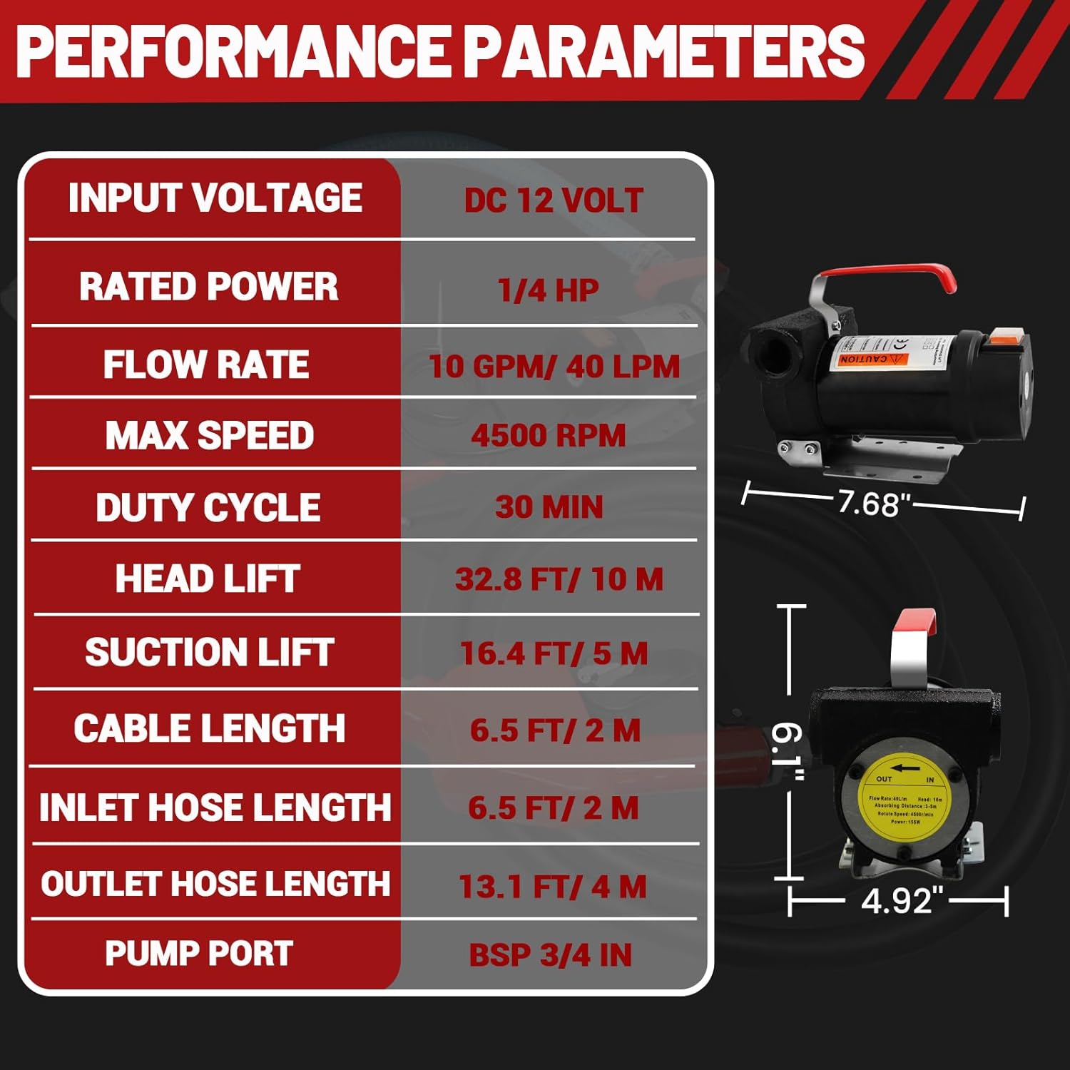 A Bomba de Transferência de Diesel 12V FUELIO vem equipada com um motor de cobre potente e um impulsor de aço fundido, capaz de operar a uma velocidade máxima de 3500 RPM. Com uma taxa de fluxo de 10 GPM (galões por minuto), esta bomba é projetada para oferecer um desempenho excepcional, com uma capacidade de sucção máxima de 13 pés e uma altura máxima de até 26 pés.