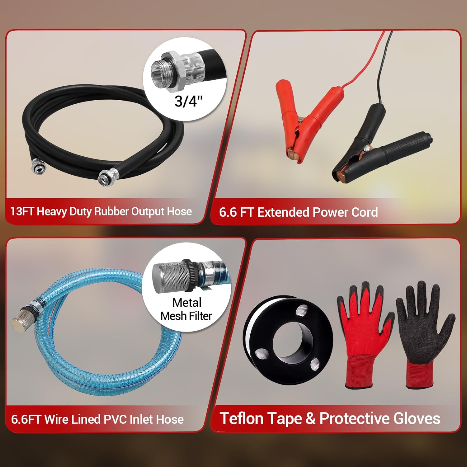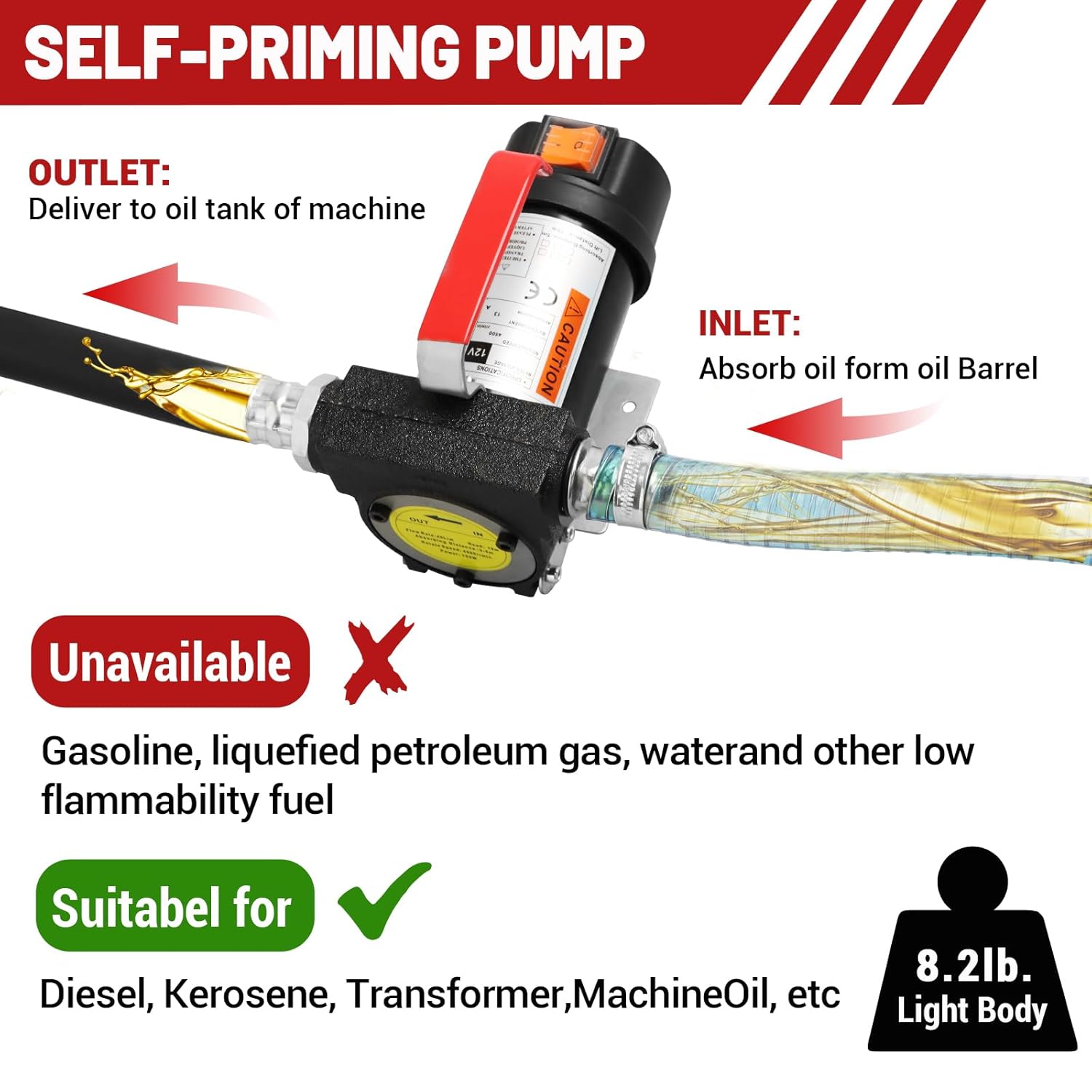 Bomba de Transferência de Diesel 12V com Nozzle Automático, Mangueira de 6,5FT em PVC e 13FT em Borracha, Case Portátil