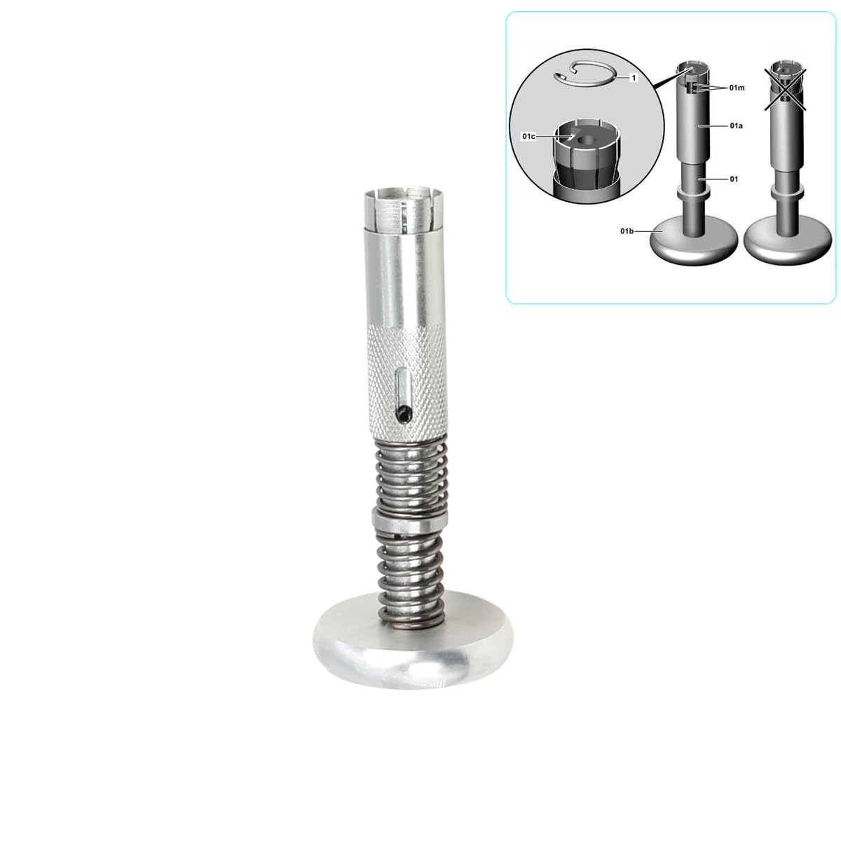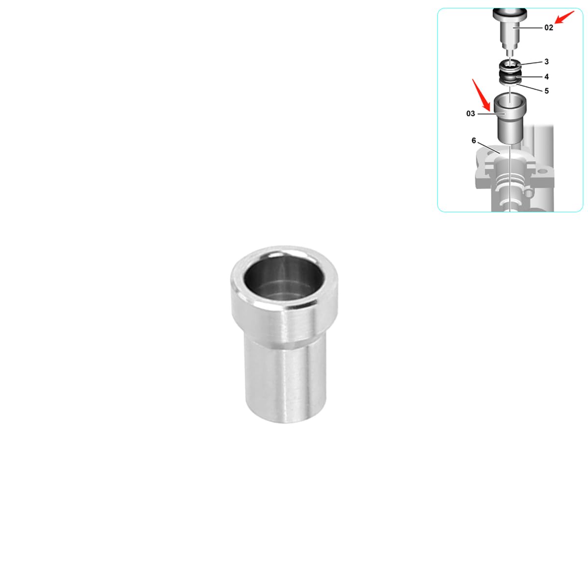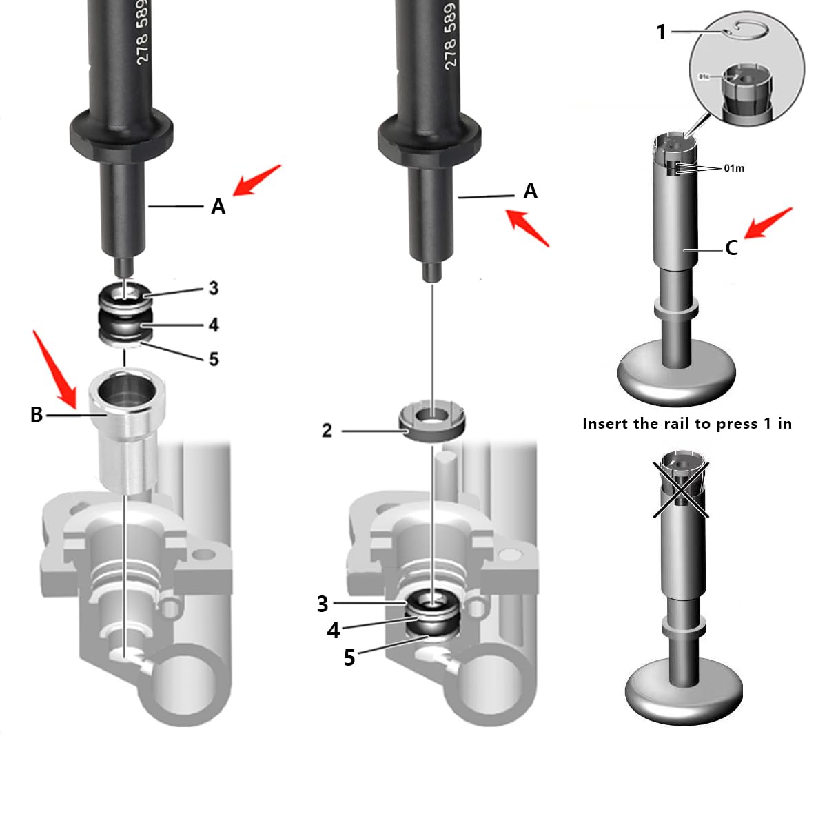 Para utilizar o kit de forma eficaz, comece removendo os selos do trilho com um alicate de bico fino para retirar o anel de retenção. Em seguida, utilize a ferramenta de vedação preta para remover a peça de suporte metálica, o anel de suporte plástico aberto, o selo e o anel de suporte branco. Para a instalação, insira o anel de suporte plástico aberto, o selo e o anel de suporte branco na ferramenta de vedação preta e, em seguida, em outra ferramenta de soquete. Insira isso no trilho para pressioná-lo e, por fim, coloque manualmente a peça de suporte metálica no lugar. O anel de retenção deve ser inserido na ferramenta de compressão de mola e, em seguida, inserido no trilho e pressionado.