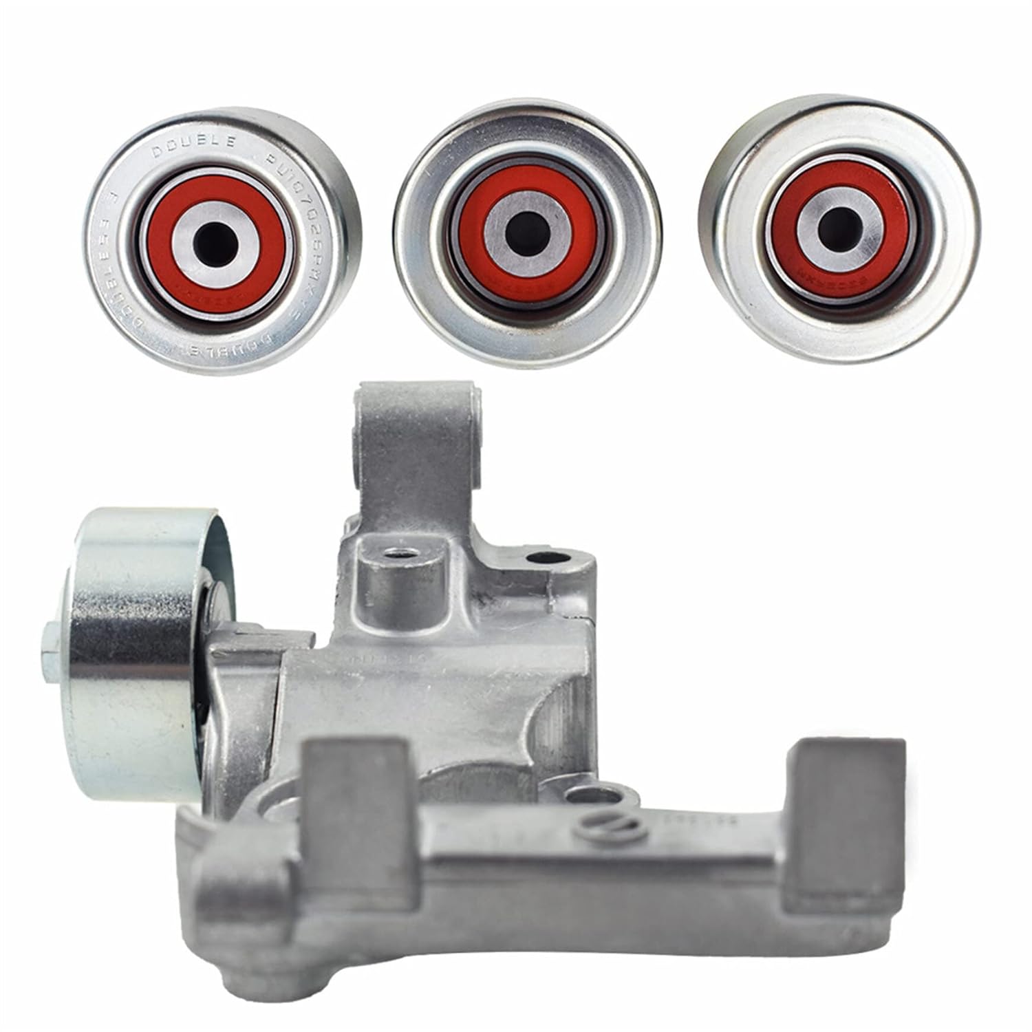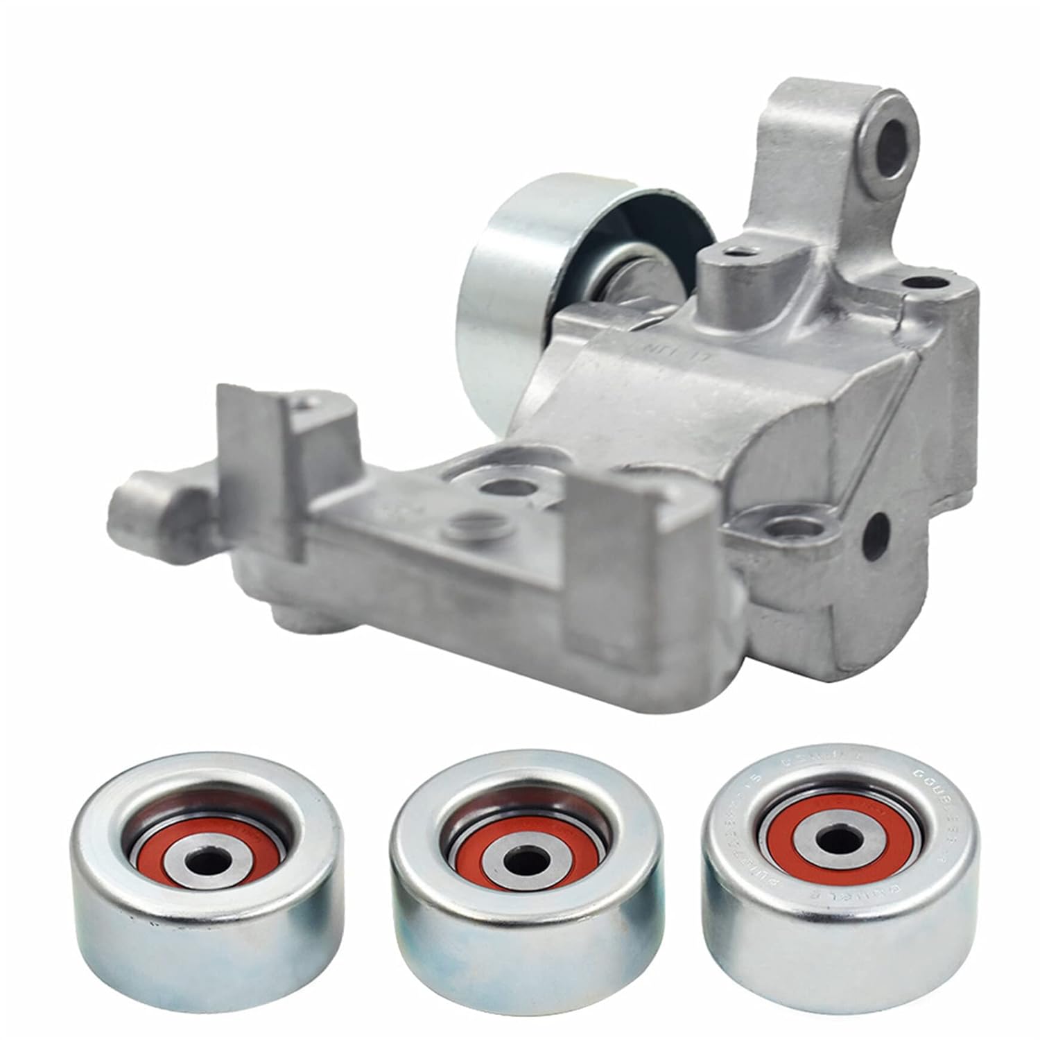 O pacote inclui o tensionador de correia e três polias, conforme mostrado na imagem, facilitando a instalação e garantindo que todos os componentes necessários estejam disponíveis para uma substituição completa.
