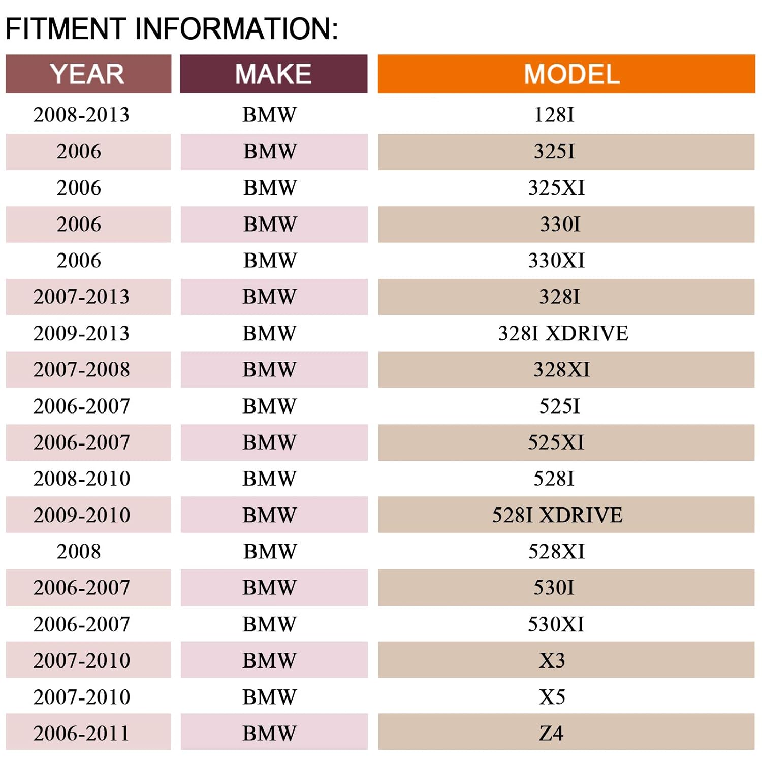 - Compatibilidade: 2008 – 2013 para BMW 128i 3.0L; 2006 para BMW 325i/325xi/330i/330xi 3.0L; 2007 – 2013 para BMW 328i 3.0L; 2009 – 2013 para BMW 328i xDrive 3.0L; 2007 – 2008 para BMW 328xi 3.0L; 2006 – 2007 para BMW 525i/525xi 3.0L; 2008 – 2010 para BMW 528i 3.0L; 2009 – 2010 para BMW 528i xDrive 3.0L.