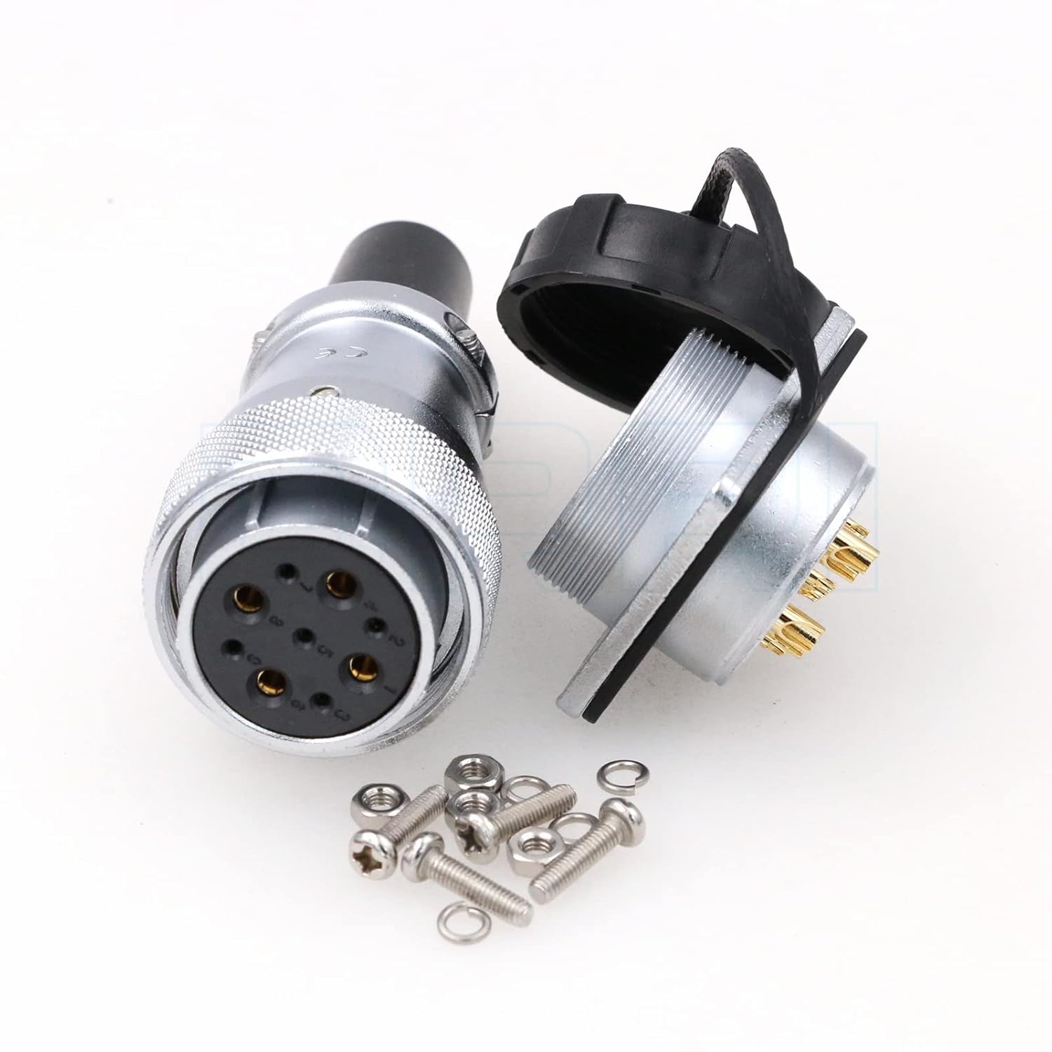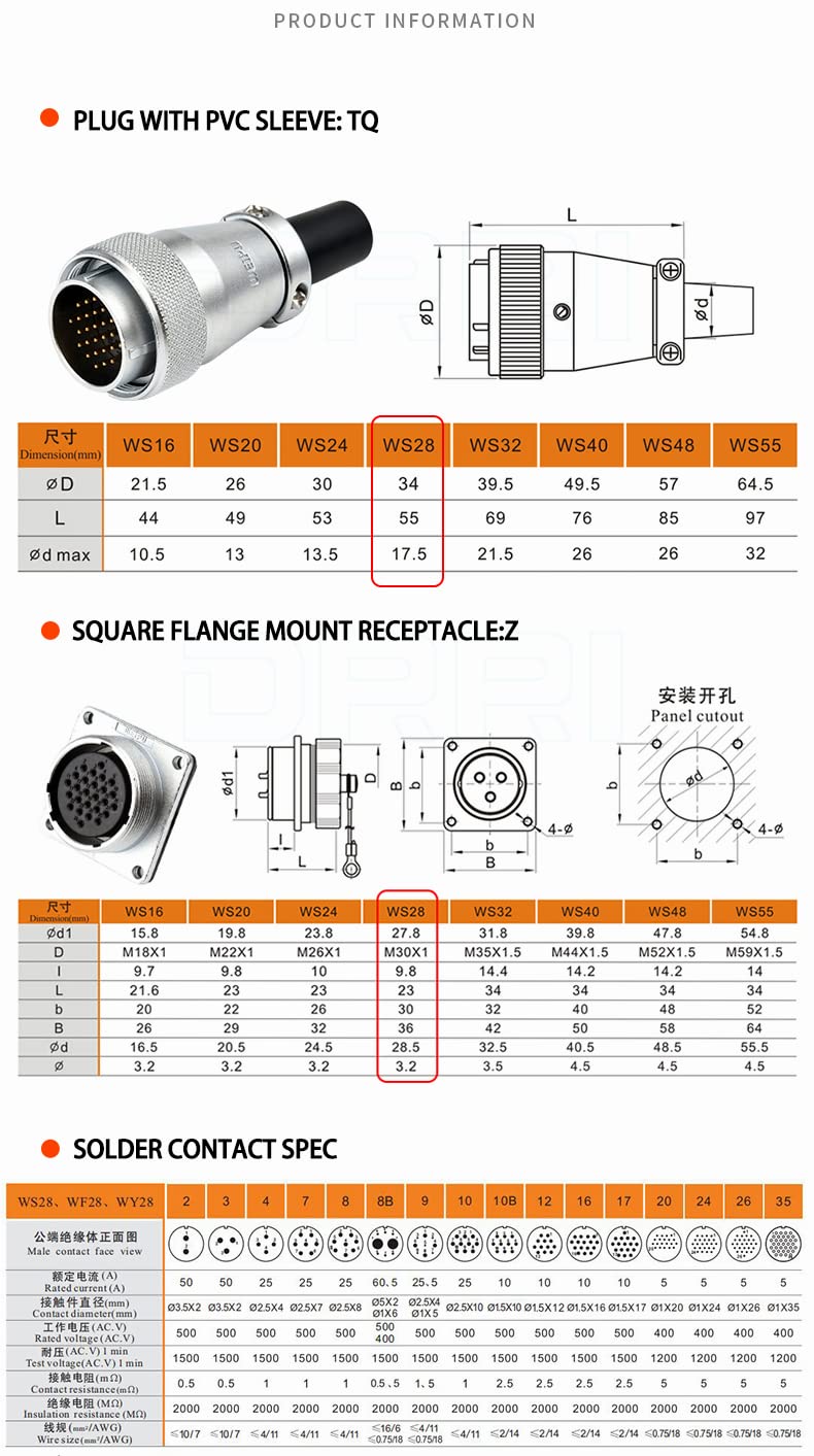 Com 9 pinos, o WS28 apresenta um diâmetro de contato de Φ2.5×4 e Φ1×5, com uma resistência de contato de apenas 1/5mΩ, o que assegura uma transmissão de sinal eficiente e estável. O tamanho do fio compatível é de até 4mm² (11 AWG), permitindo uma ampla gama de aplicações. Este conector é projetado para cortes de painel de 28.5mm a 32mm, com contatos banhados a ouro, garantindo uma conexão duradoura e de alta qualidade.