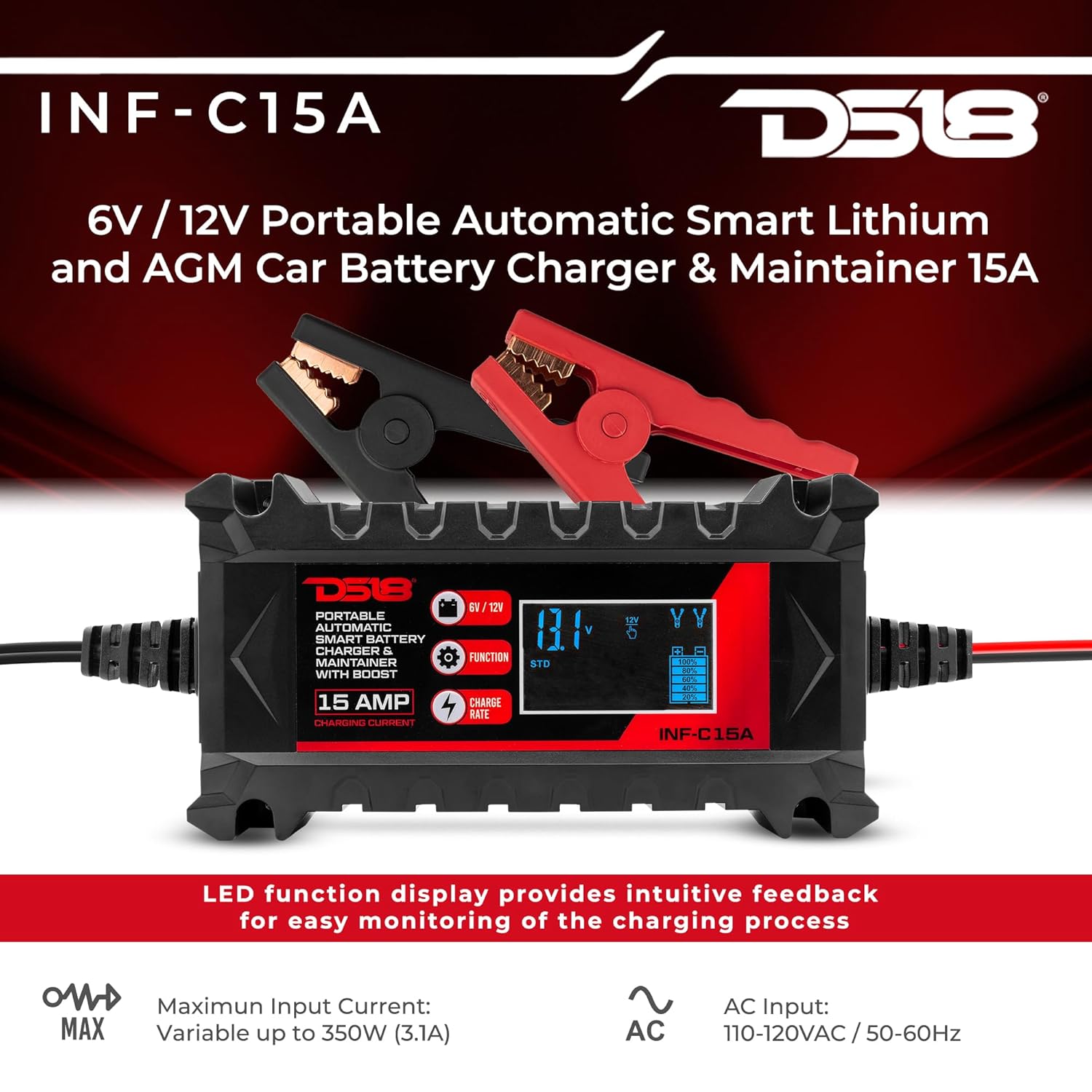 Carregador de Bateria Automotivo DS18 INF-C15A 6V/12V Inteligente Portátil para Baterias de Lítio e AGM