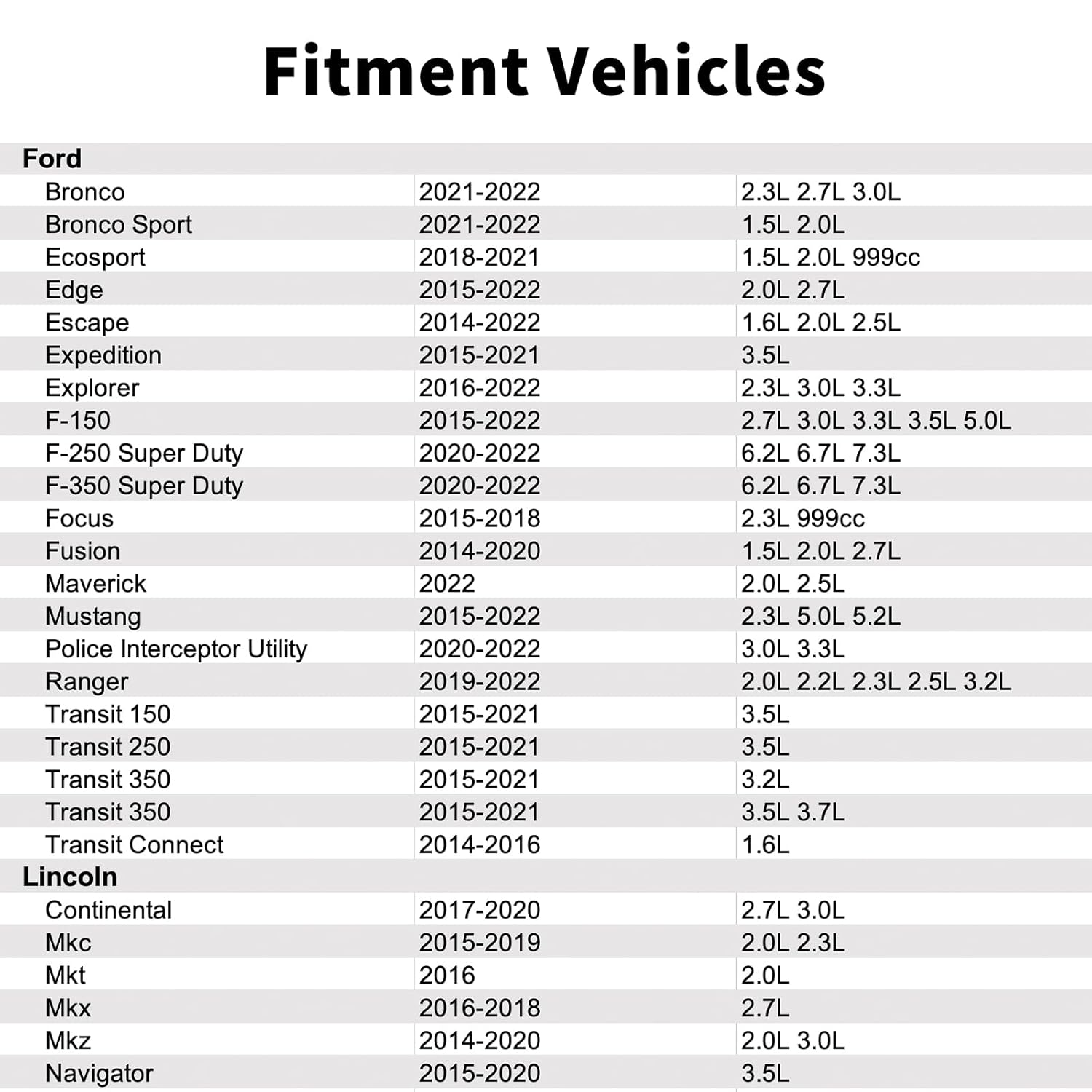 – Ford: 2021-2022 Bronco (2.3L, 2.7L, 3.0L), 2018-2021 Ecosport (1.5L, 2.0L), 2015-2022 Expedition (3.5L), 2015-2022 F-150 (2.7L a 5.0L), entre outros.