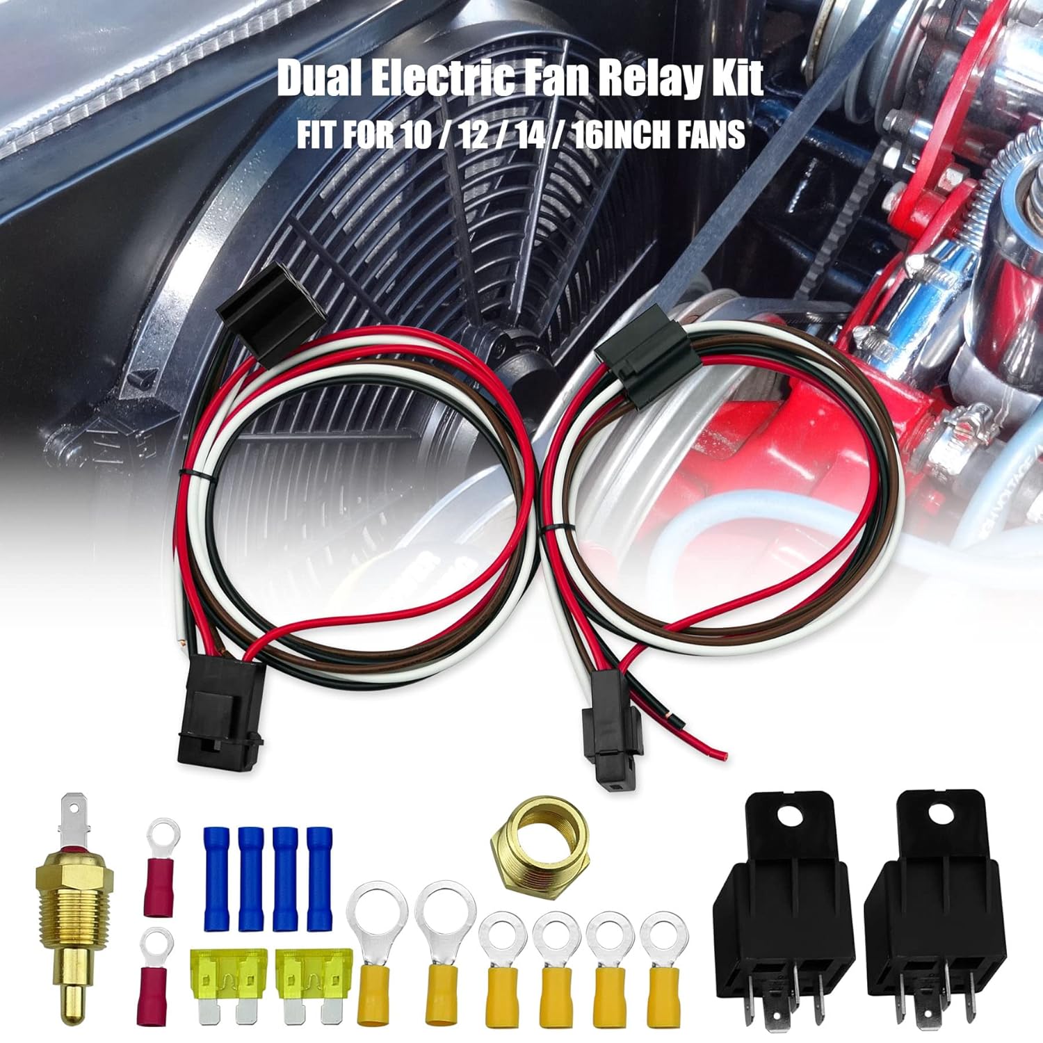 Kit de Relé para Ventilador Duplo com Termostato, acionando a 185°F e desligando a 175°F. Este kit de fiação para ventilador elétrico de radiador suporta até 40 Amp, garantindo um resfriamento eficiente do motor. Principais características incluem fácil instalação, controle automático de temperatura e alta capacidade de corrente, proporcionando maior durabilidade e desempenho. Ideal para quem busca otimizar o sistema de resfriamento do veículo, prevenindo superaquecimento e melhorando a eficiência do motor.