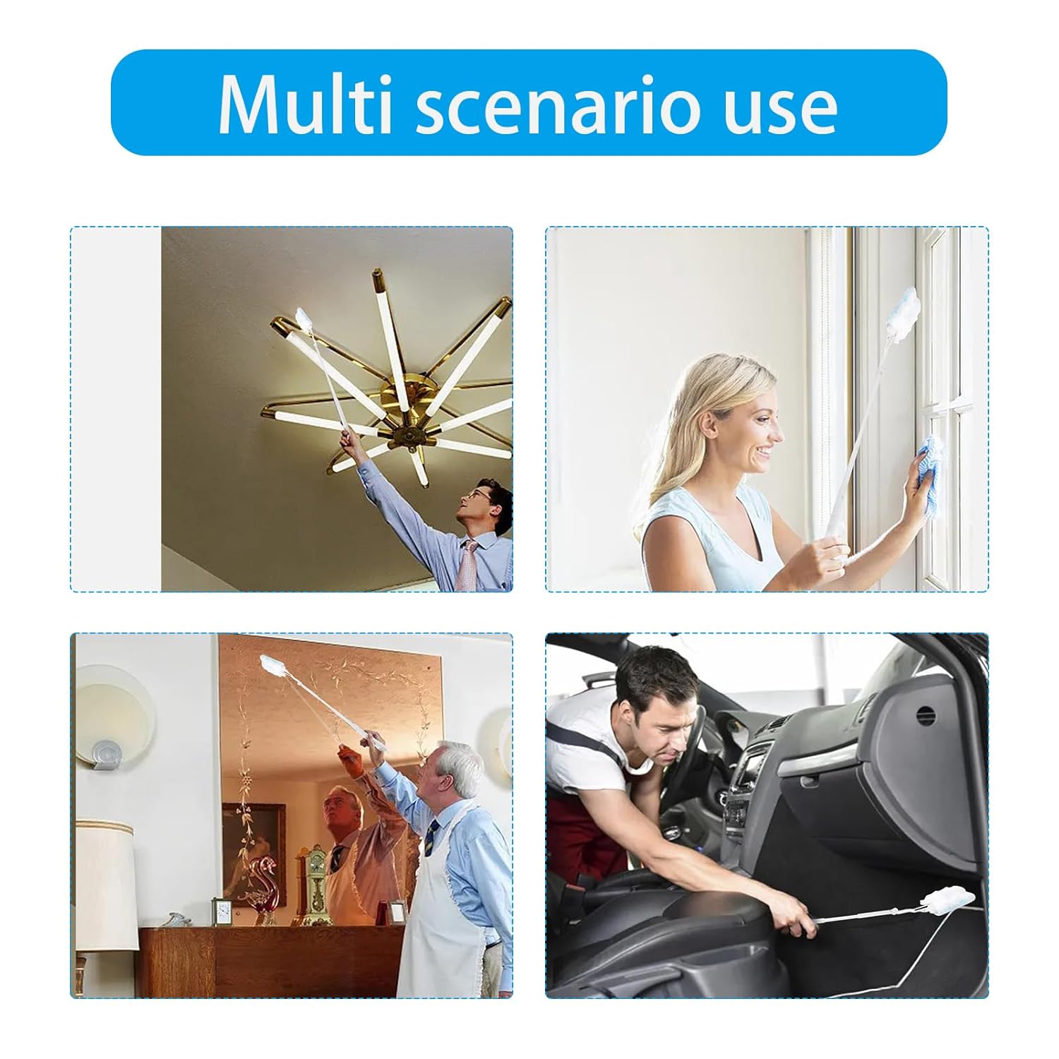 3. Limpeza: Utilize o duster para limpar superfícies, cantos e áreas de difícil acesso. O design flexível permite alcançar 360 graus, garantindo que não haja pontos mortos.