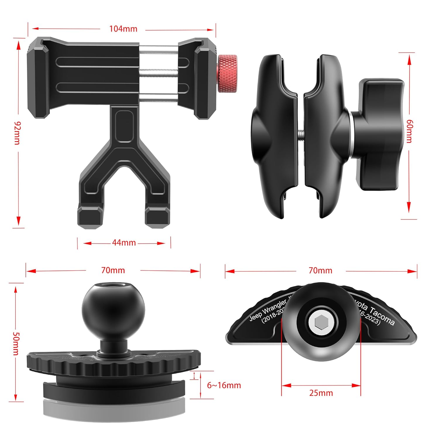 O suporte de telefone do Jeep Sahara é ajustável e pode acomodar qualquer telefone com tamanhos variando de 4″ a 7″, mantendo seu dispositivo totalmente funcional e acessível.