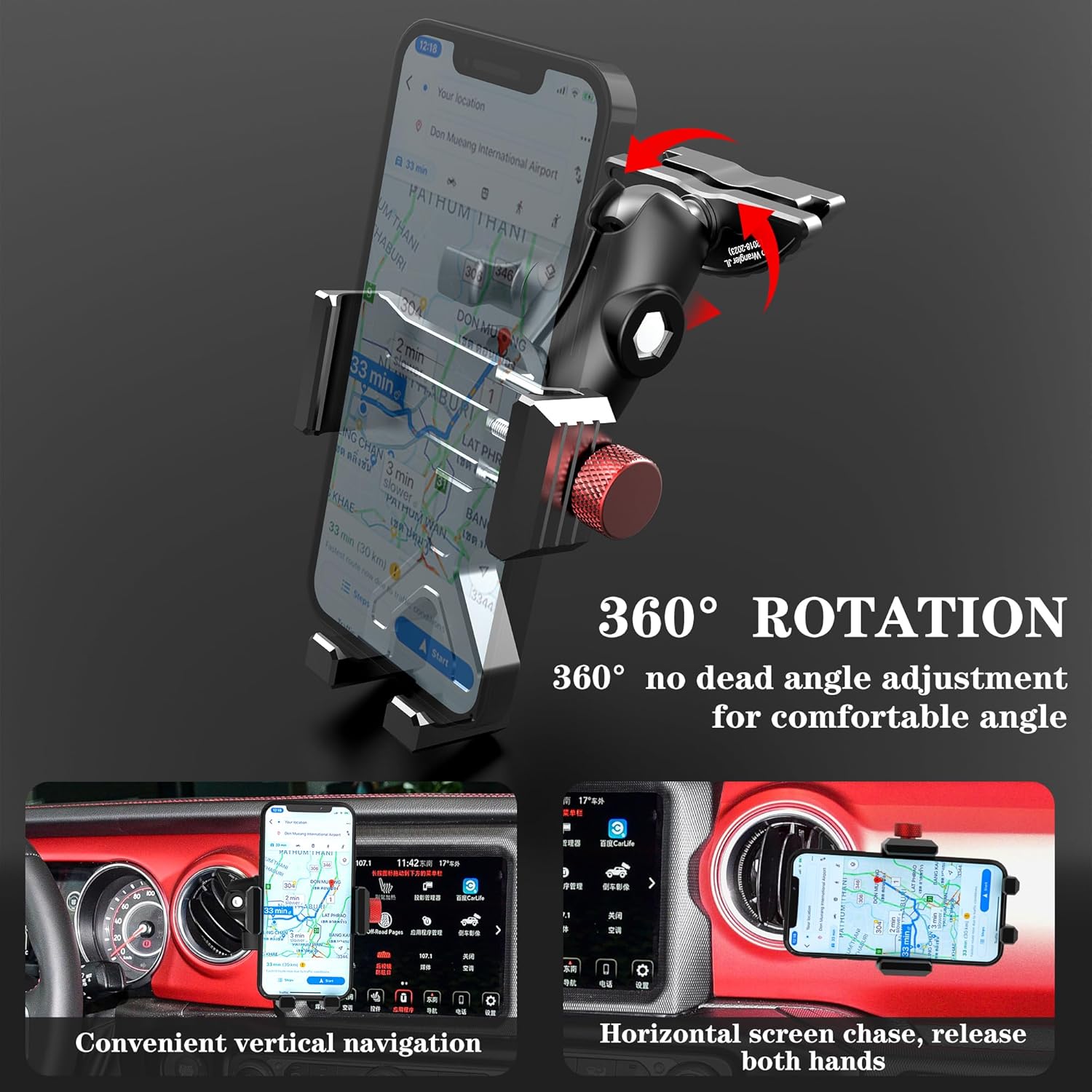 O suporte de telefone EASEORD possui um recurso de bloqueio que se fixa firmemente ao painel de controle das saídas de ar do seu Jeep. Isso cria uma base de montagem robusta para um suporte universal de telefone, eliminando qualquer movimento indesejado, mesmo em terrenos acidentados ou durante off-roading. Fabricado com componentes de alumínio de alta qualidade, este suporte é projetado para suportar os ambientes mais exigentes, permitindo que você explore com confiança.