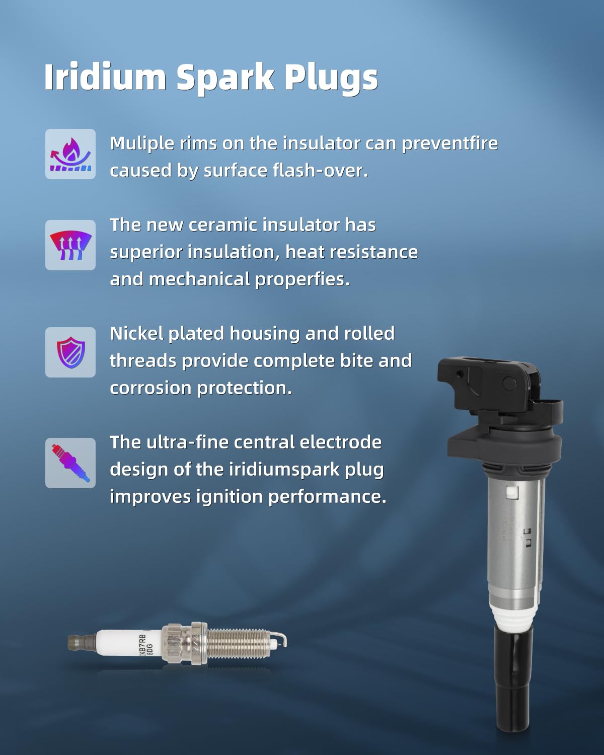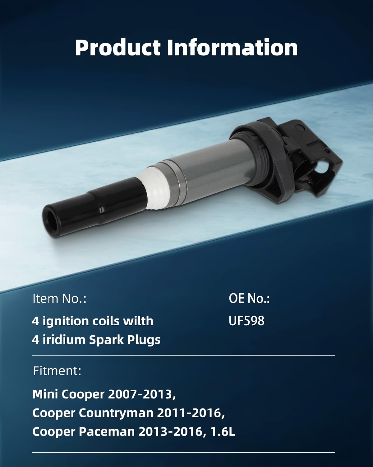 As bobinas de ignição ECCPP, acompanhadas de 4 velas de ignição de irídio, são a escolha ideal para quem busca desempenho e confiabilidade em veículos Mini Cooper fabricados entre 2007 e 2016. Este conjunto é compatível com os modelos R52 L4 1.6L (2007), R52/R57/R58 L4 1.6L Turbo (2008-2013), Cooper Countryman R58 L4 1.6L Turbo (2011-2016) e Cooper Paceman R58 L4 1.6L Turbo (2013-2016).