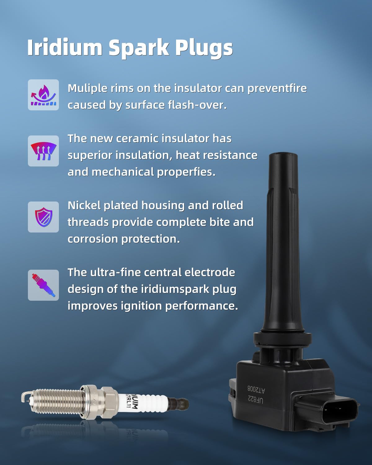 Este conjunto oferece 15% mais energia em comparação com as bobinas OE, melhorando o desempenho do motor. As bobinas de ignição fornecem a faísca necessária para o funcionamento do motor. Com o tempo, as bobinas e velas de ignição de fábrica podem falhar, levando a uma má eficiência de combustível, falhas de ignição, hesitação e acendimento das luzes de verificação do motor (CEL) e do sistema de controle de estabilidade (VSC). Recomenda-se substituir as bobinas e velas simultaneamente para garantir um desempenho superior em partidas a frio e um funcionamento mais suave do motor.