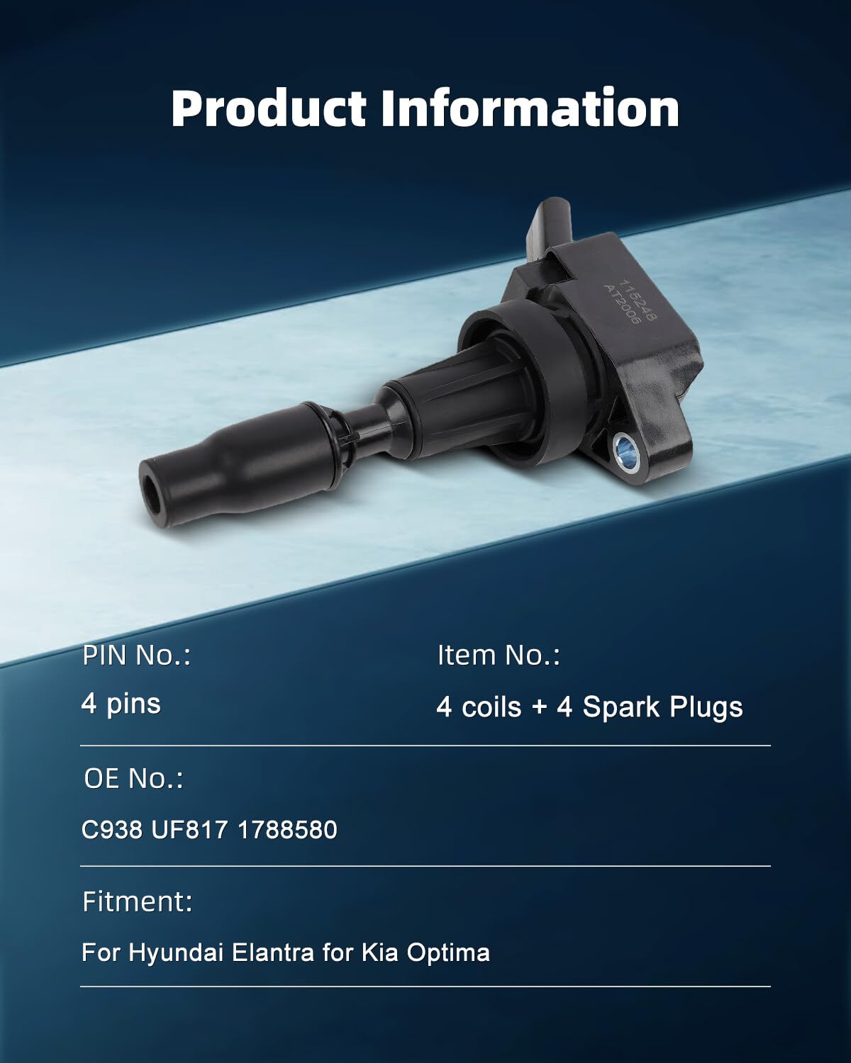 Bobinas de Ignição ECCPP com 4 Velas de Ignição de Irídio UF817 para Hyundai Elantra 2017-2020, Sonata 2015-2019, Tucson 2016-2018 e Kona