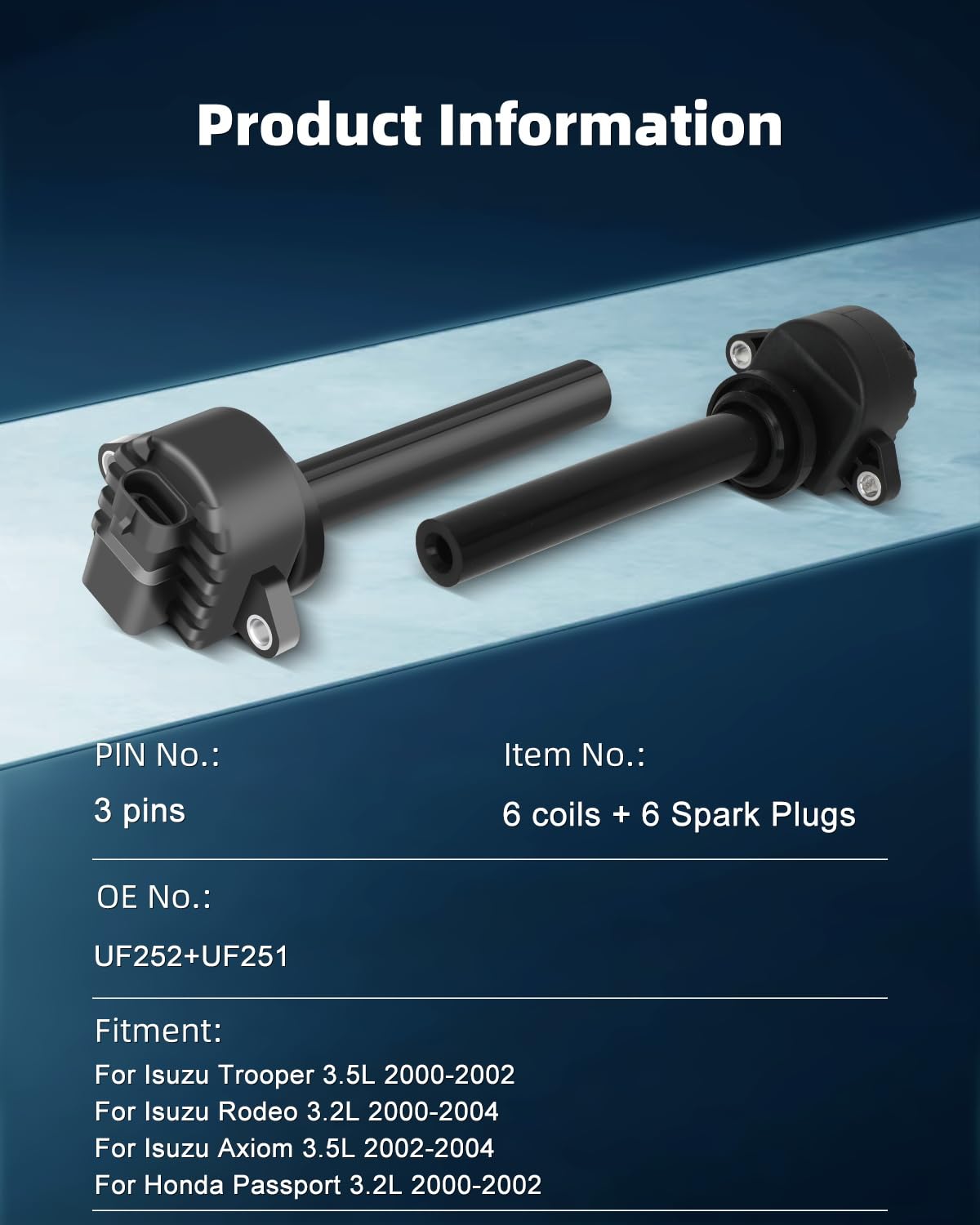As bobinas de ignição ECCPP, acompanhadas de 6 velas de ignição de irídio, são a escolha ideal para quem busca desempenho e confiabilidade em veículos Isuzu. Este conjunto é compatível com os modelos Isuzu Trooper 3.5L (2000-2002), Isuzu Rodeo 3.2L (2000-2004), Isuzu Axiom 3.5L (2002-2004) e outros, garantindo uma substituição eficaz e de alta qualidade para as bobinas de ignição danificadas ou desgastadas.