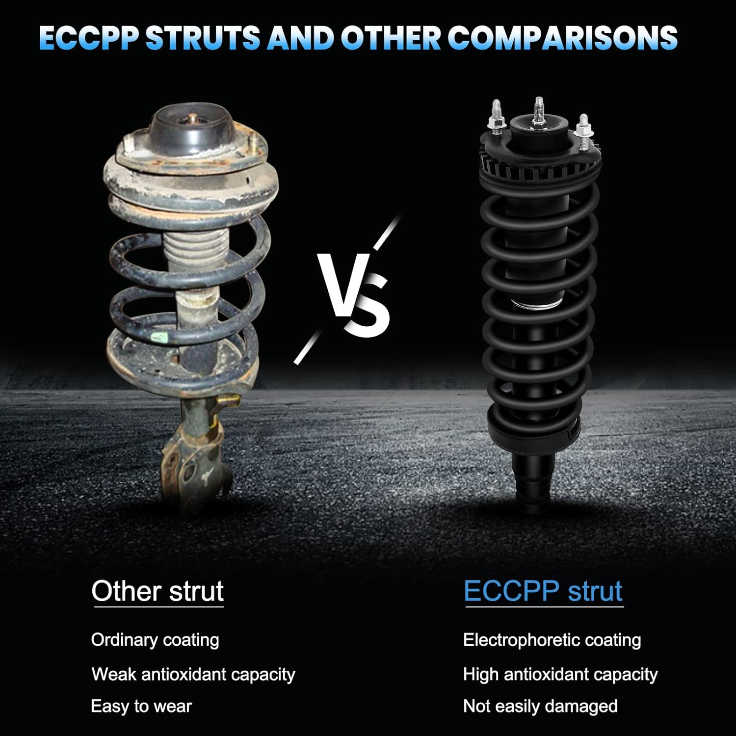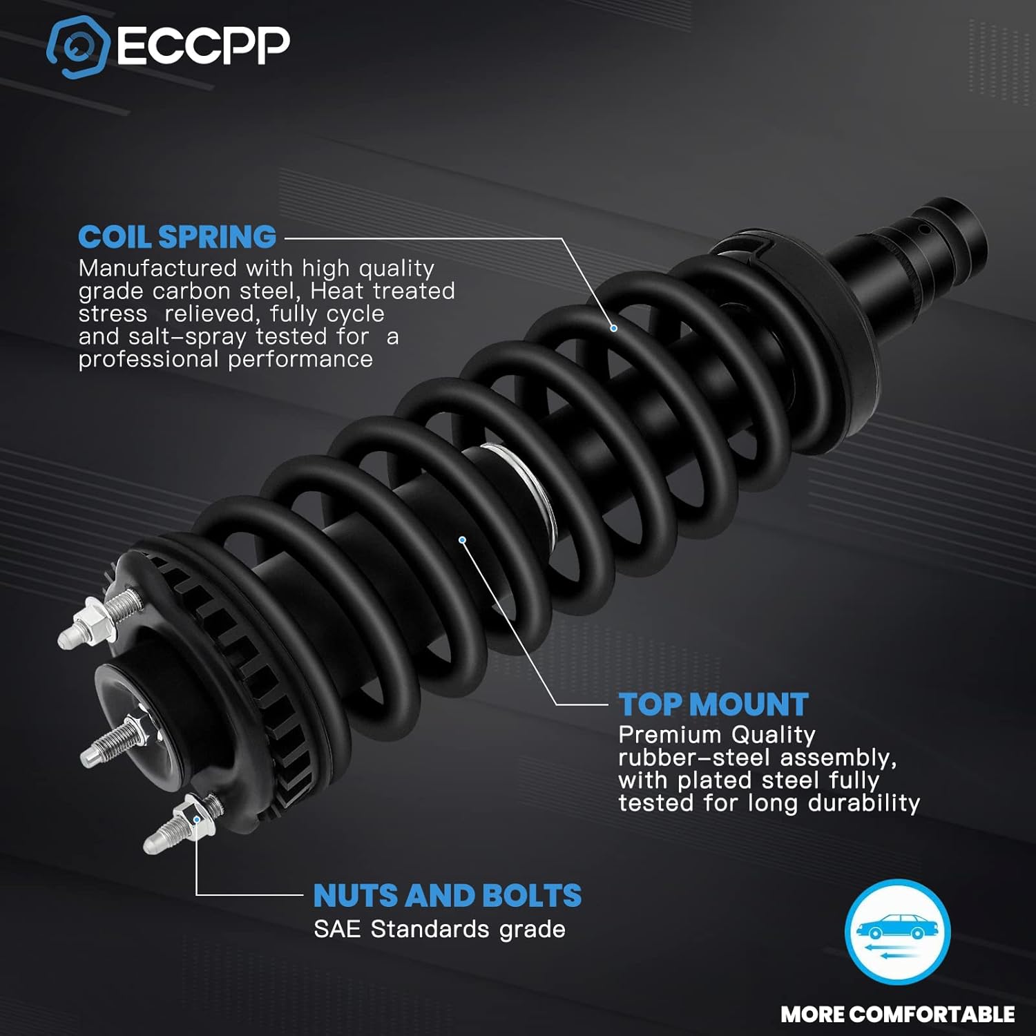Fabricado sob rigorosos padrões ISO/TS16949, o ECCPP strut é construído com aço de mola SAE9254, que proporciona uma resistência e durabilidade excepcionais. O tratamento de superfície especial garante proteção superior contra corrosão, aumentando a tolerância a vibrações e temperaturas extremas, o que é essencial para a longevidade do produto.