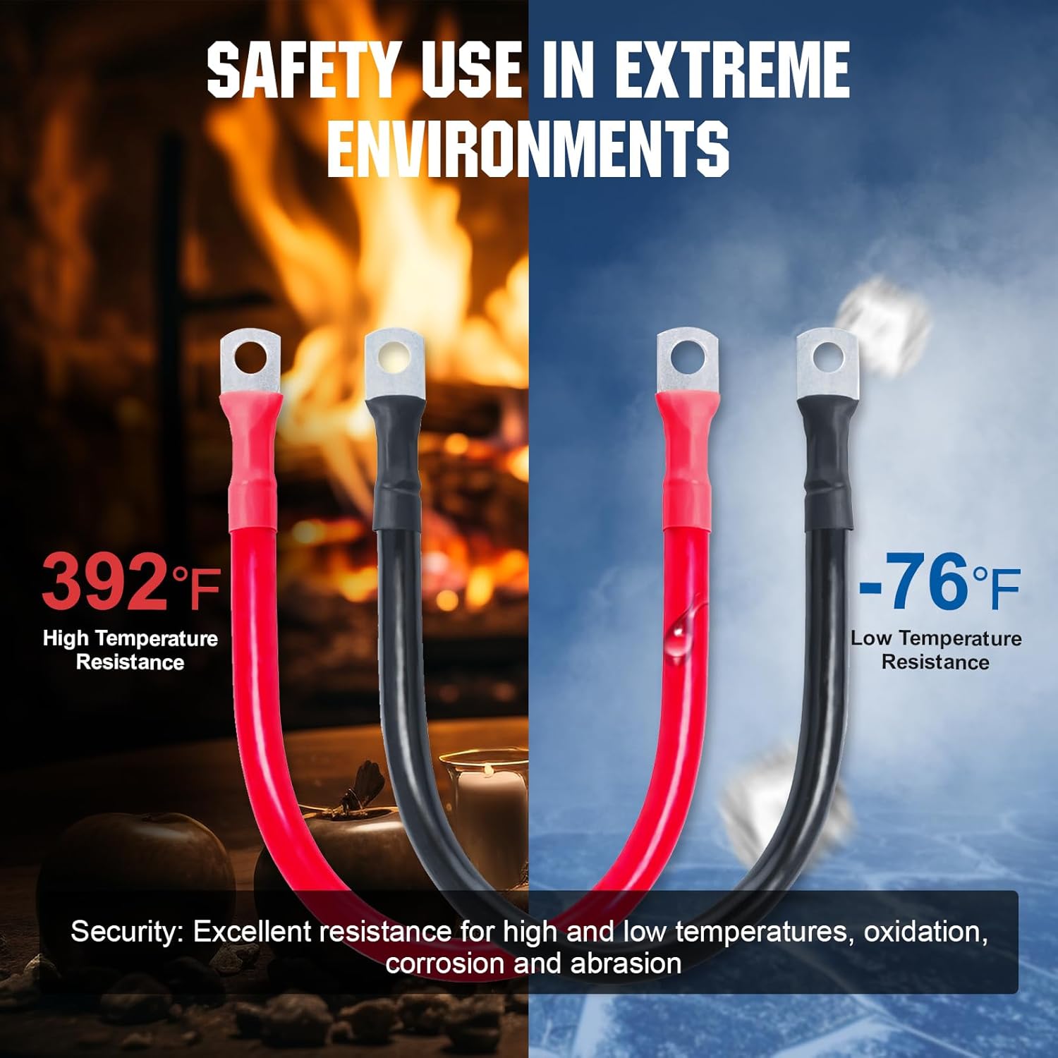 Os terminais de olhal de 15/64” são revestidos de níquel, o que proporciona resistência à corrosão e uma condutividade elétrica estável. Isso assegura que você tenha uma conexão segura e eficiente, mesmo em condições adversas. Com uma resistência excepcional a altas temperaturas, chamas, corrosão, oxidação e abrasão, esses cabos são projetados para suportar uma corrente máxima de 80 A, operando em uma faixa de temperatura que varia de -76 ℉ a 392 ℉.