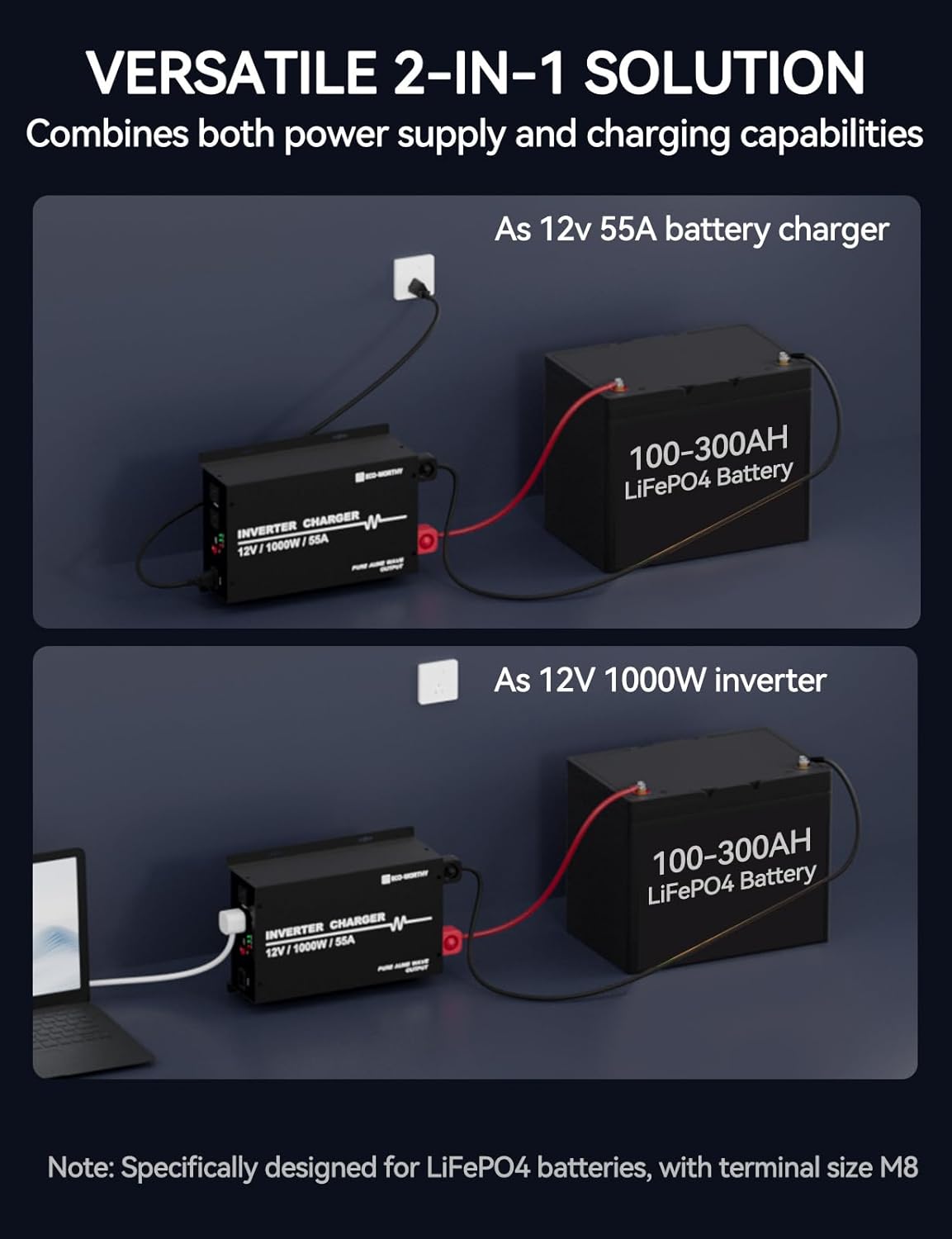 This is for “ECO-WORTHY Inverter Charger 55A LiFePO4 Battery Charger with 1000W Inverter Pure Sine Wave 12V to 110V”