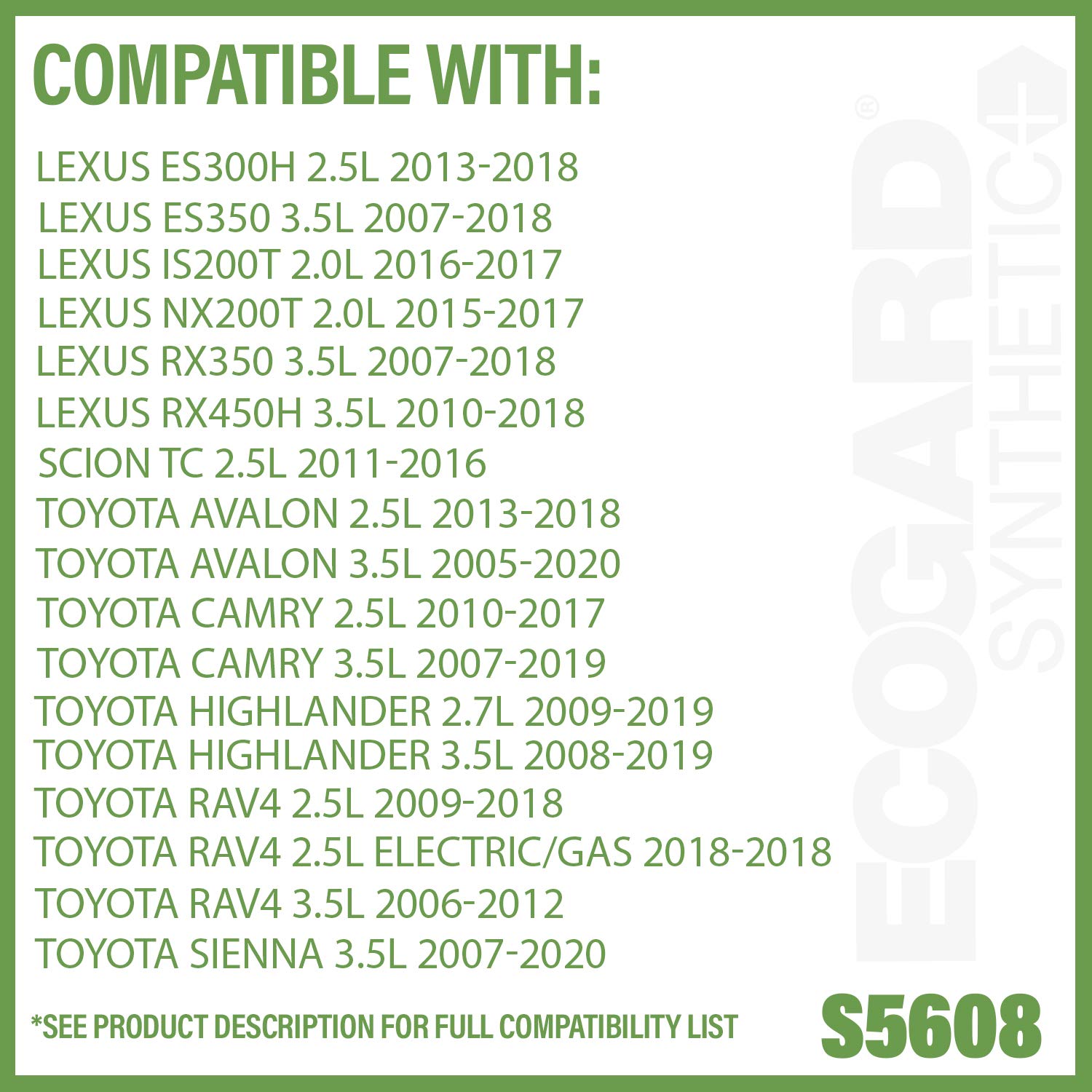 Resposta: Sim, o ECOGARD S5608 é compatível com diversos modelos Toyota e Lexus, incluindo Camry, RAV4, Highlander, Sienna e outros. Verifique a lista de compatibilidade acima para confirmar.
