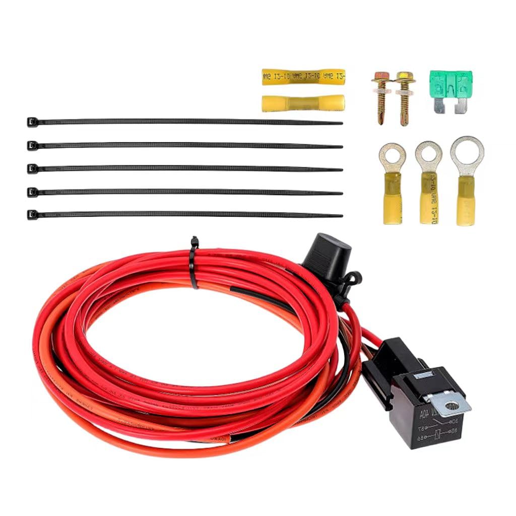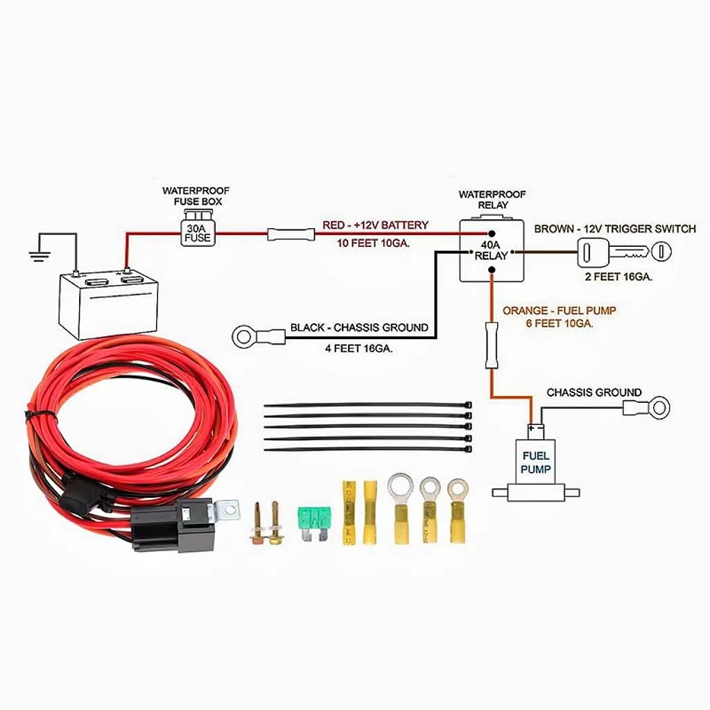 Compatível com sistemas universais de 12V, o kit pode ser utilizado em qualquer dispositivo ativado por 12V que não exceda 40 ampères contínuos. A instalação é facilitada por fios claramente rotulados e codificados por cores, além de um diagrama de fiação de fácil compreensão incluído no pacote. O kit contém um fio vermelho de 10 pés (3 metros) para a bateria de +12V, um fio laranja de 6 pés (2 metros) para a bomba de combustível, um fio marrom de 2 pés (0,6 metros) para o interruptor de acionamento de 12V e um fio preto de 4 pés (1,2 metros) para o aterramento do chassi.