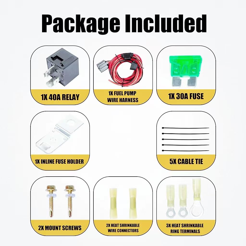 O Kit de Relé para Bomba de Combustível Elétrica inclui tudo o que você precisa para uma instalação completa: um diagrama de fiação, um relé à prova d’água de 40 ampères, base do relé com fiação, suporte de fusível à prova d’água, fusível de 30 ampères, 2 parafusos de montagem do relé, 3 terminais de anel com encolhimento térmico e 2 conectores de fio.
