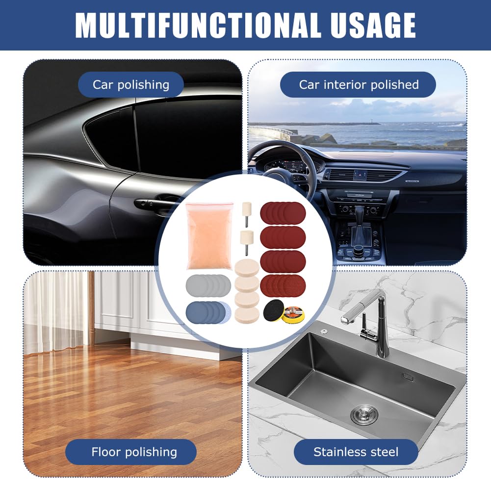 Este kit de polimento de vidro é versátil e pode ser utilizado para reparo de janelas de automóveis, polimento de detalhes de carros, lixamento, polimento, enceramento e aplicação de glaze selante, proporcionando um brilho renovado às superfícies.