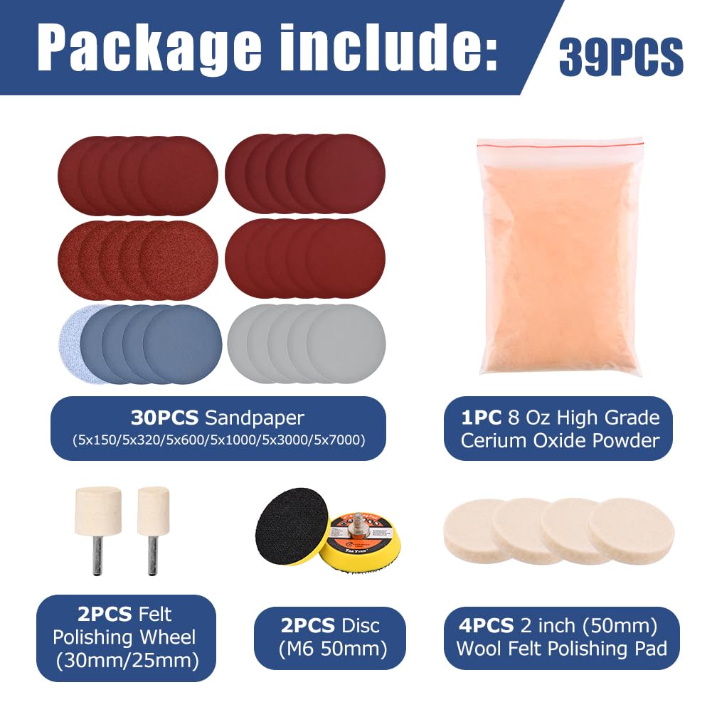 Os componentes do kit são fabricados com almofadas de lã sintética, que são flexíveis e laváveis, permitindo a reutilização. O pó de óxido de cério é o agente de polimento ideal para arranhões em vidro, devido à sua reação química e física que efetivamente remove imperfeições.