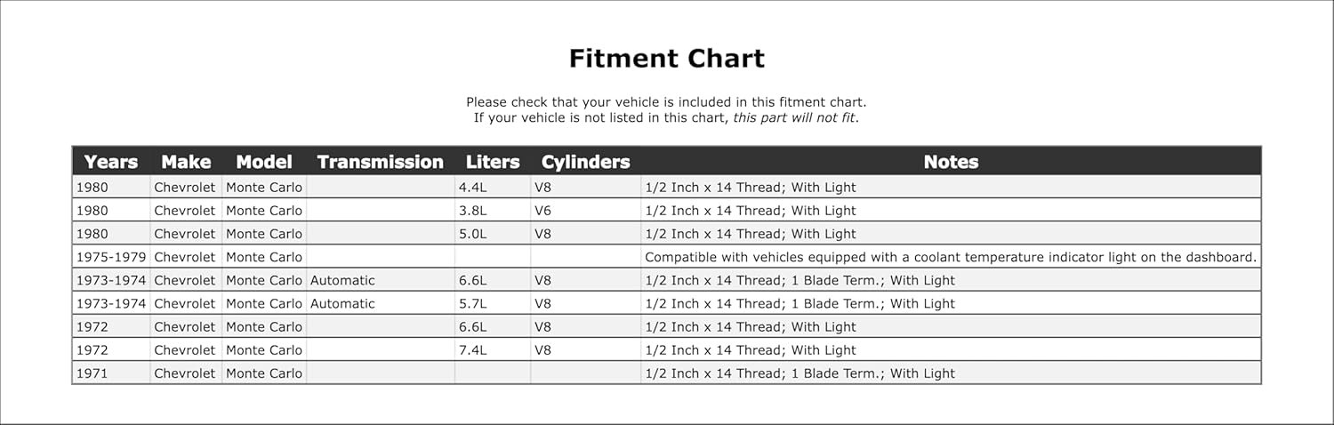Resposta: Este sensor foi projetado especificamente para o Chevrolet Monte Carlo de 1972 a 1980. Para outros modelos, verifique as especificações na galeria de imagens.