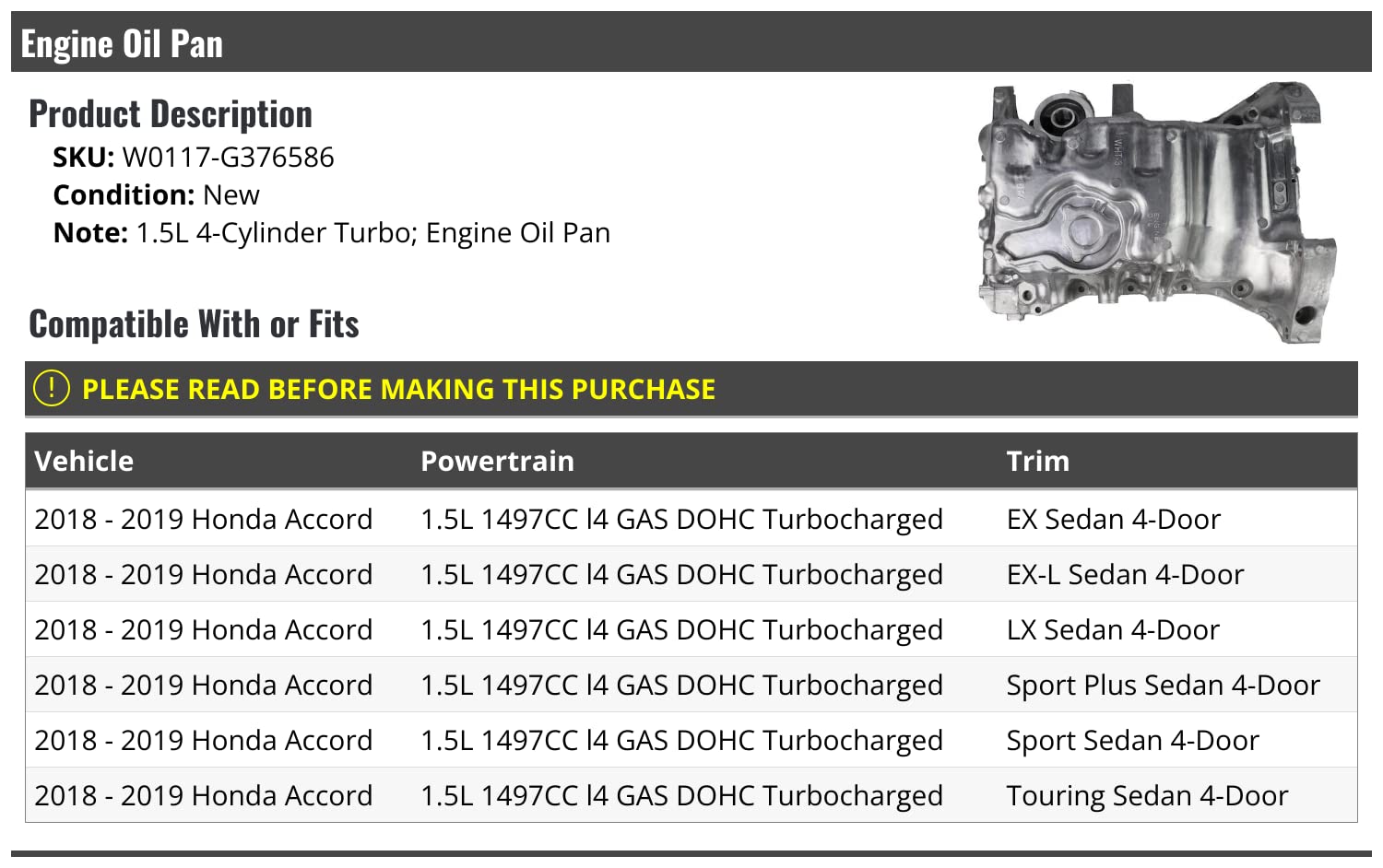 Descrição do Produto: Engine Pan – Compatível com Honda Accord 2018-2019 1.5L Turbo