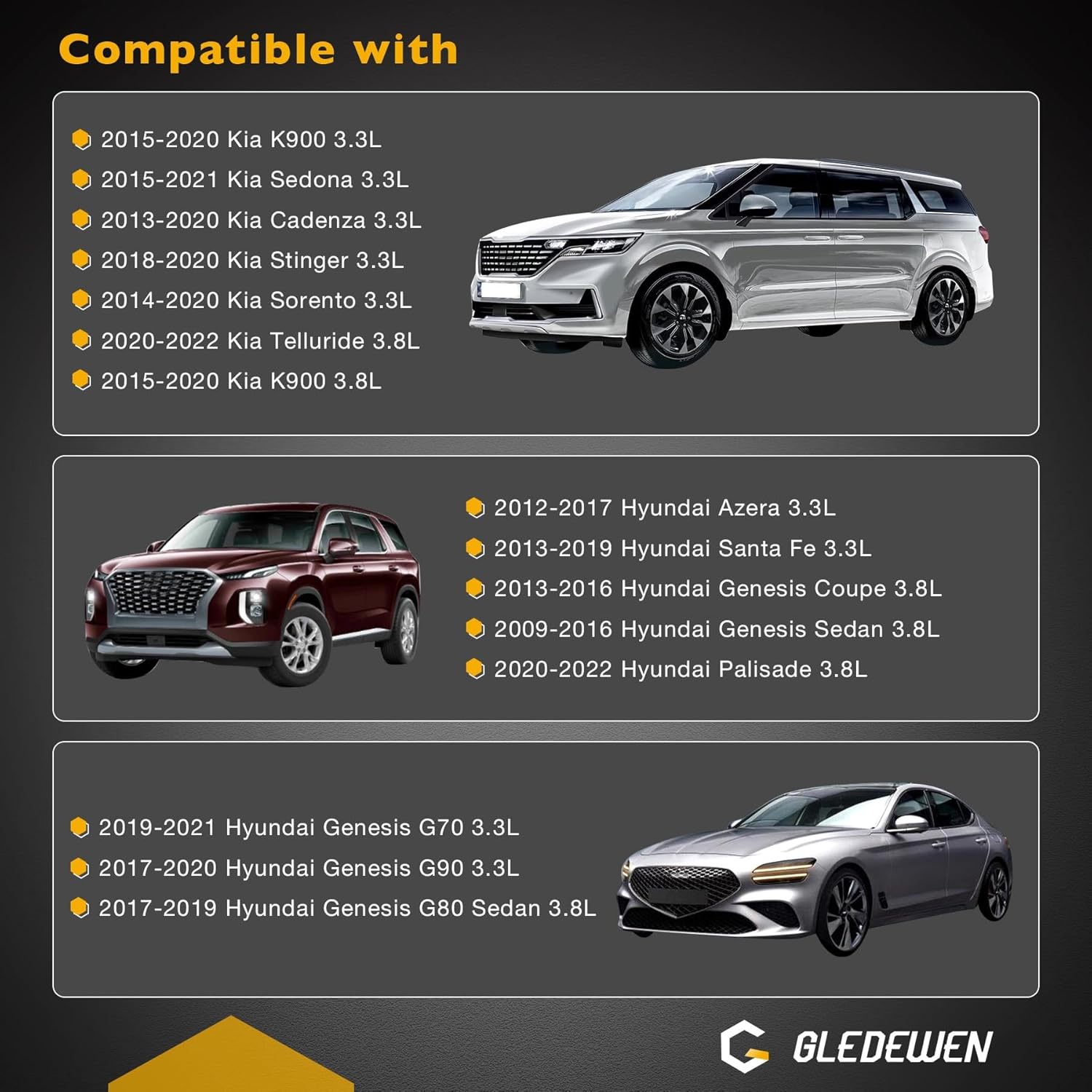 – Compatibilidade 2: Para motores 3.8L 3778CC V6 GAS DOHC naturalmente aspirados. Compatível com os seguintes modelos Kia: 2020-2022 Telluride, 2015-2020 K900; e Hyundai: 2013-2016 Genesis Coupe, 2009-2016 Genesis Sedan, 2020-2022 Palisade, 2017-2019 Genesis G80 Sedan.