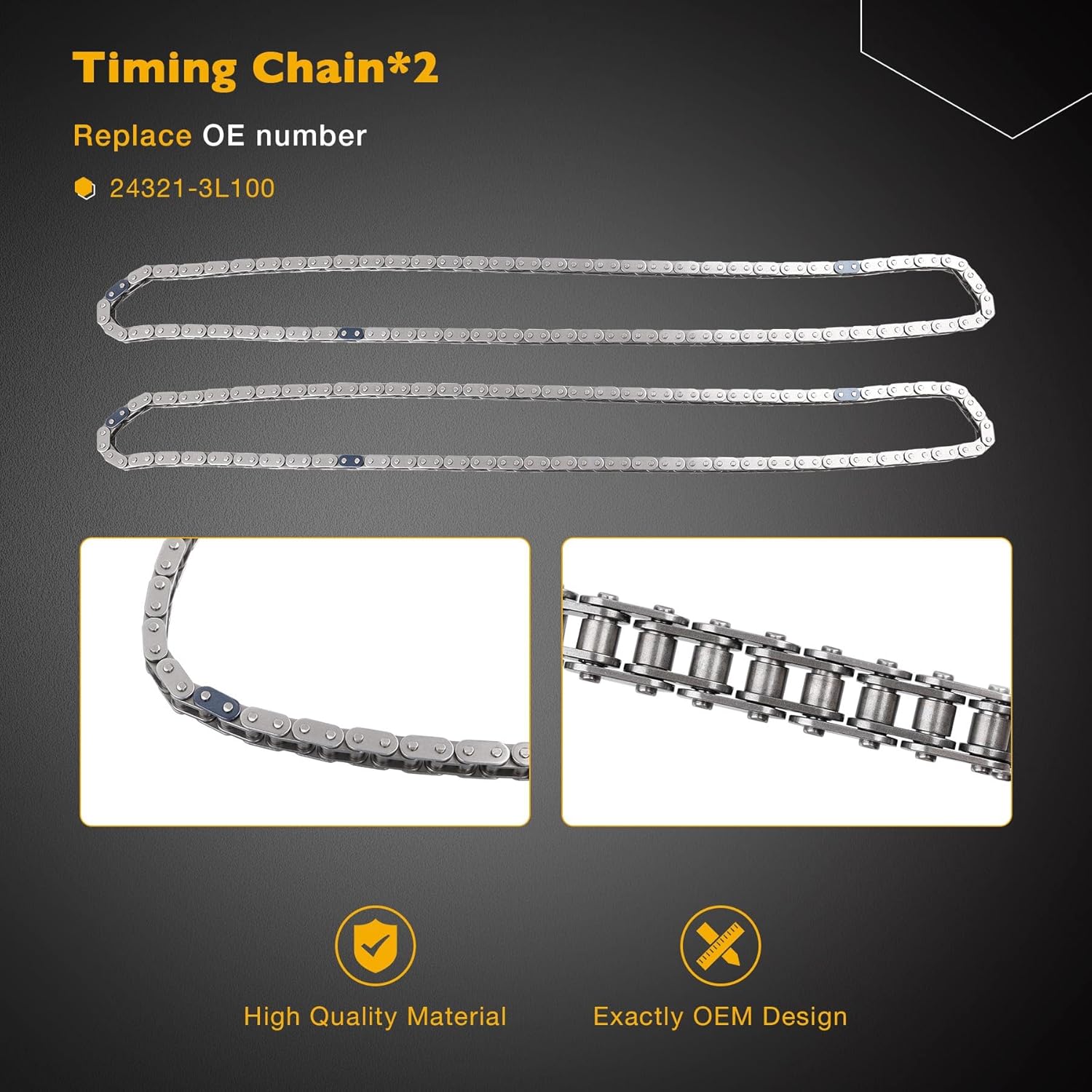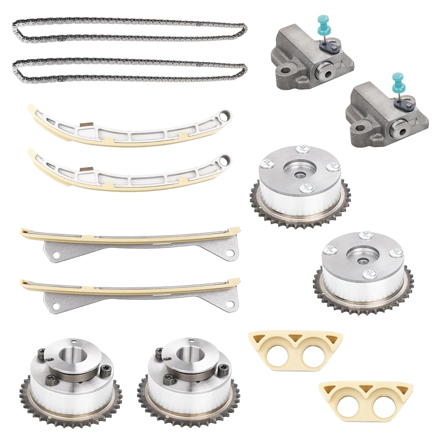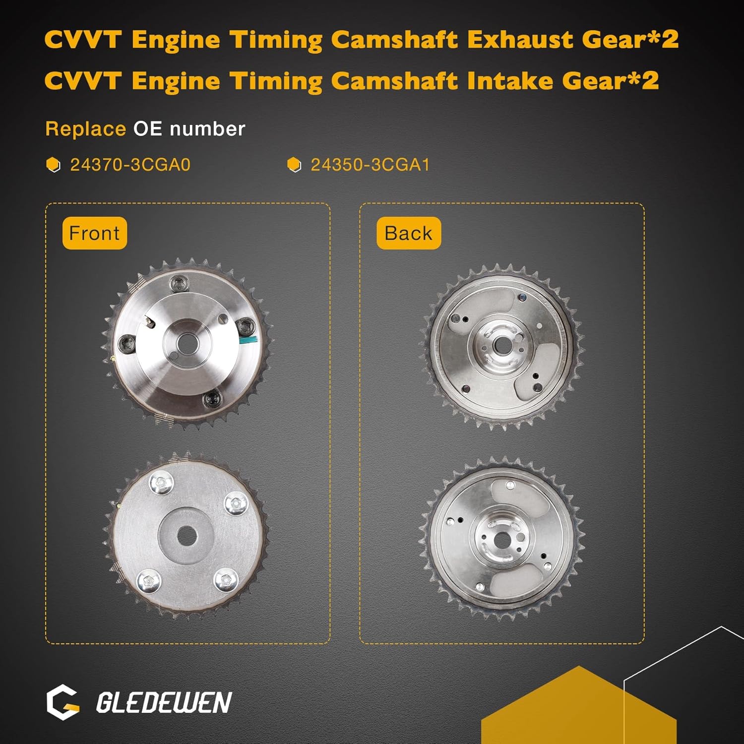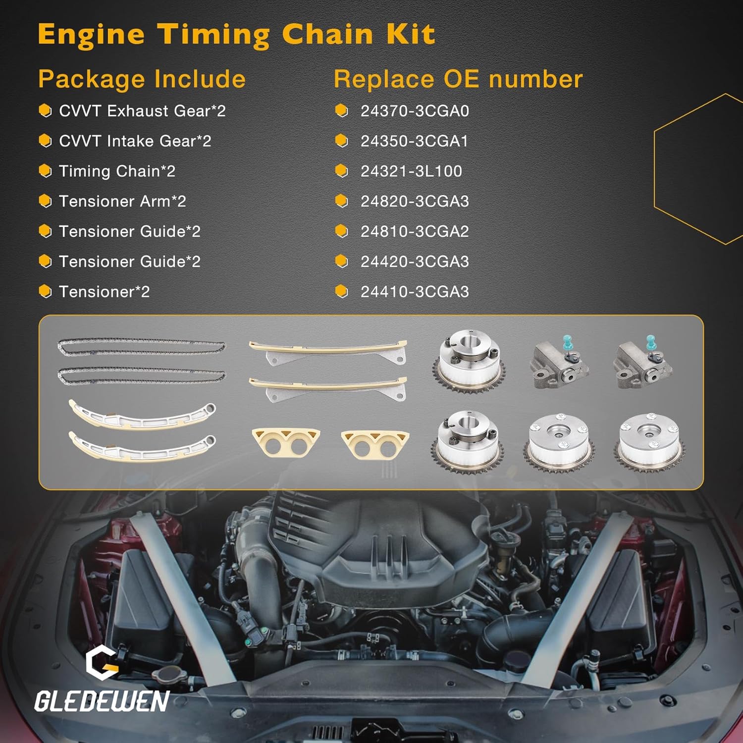 – Pacote Inclui: 2 engrenagens de escape CVVT, 2 engrenagens de admissão CVVT, 2 correntes de distribuição, 2 braços de tensionador, 4 guias de tensionador e 2 tensionadores. O conjunto de corrente de distribuição Gledewen oferece uma solução completa para o seu motor, preservando o valor a longo prazo do veículo.