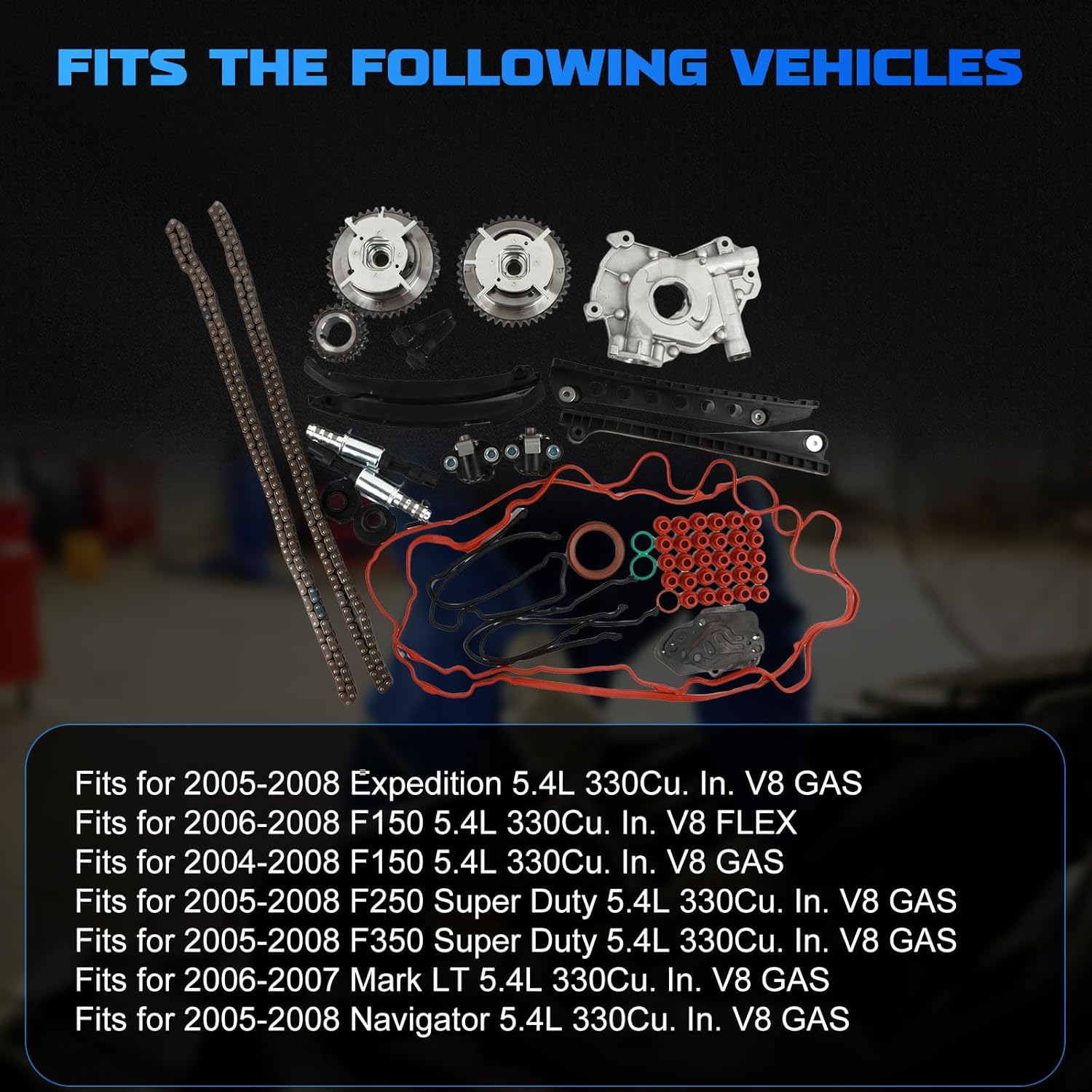 - Compatível com – Este Kit de Corrente de Distribuição é compatível com os modelos Expedition, F150, F250 Super Duty, F350 Super Duty, Mark LT e Navigator 5.4L. Para modelos específicos, consulte a descrição detalhada.